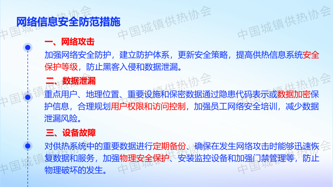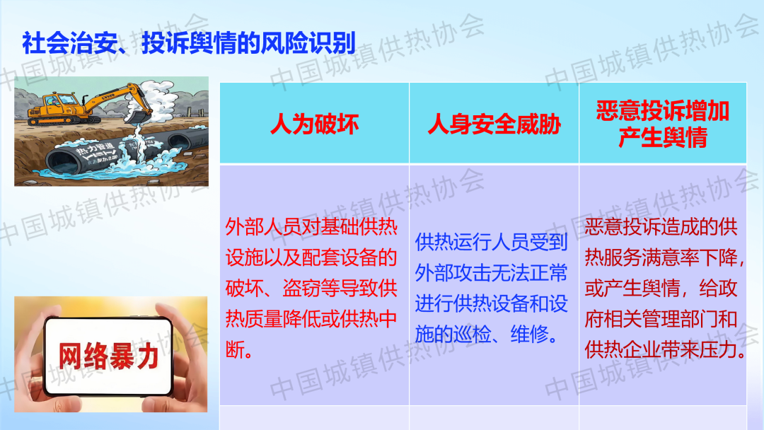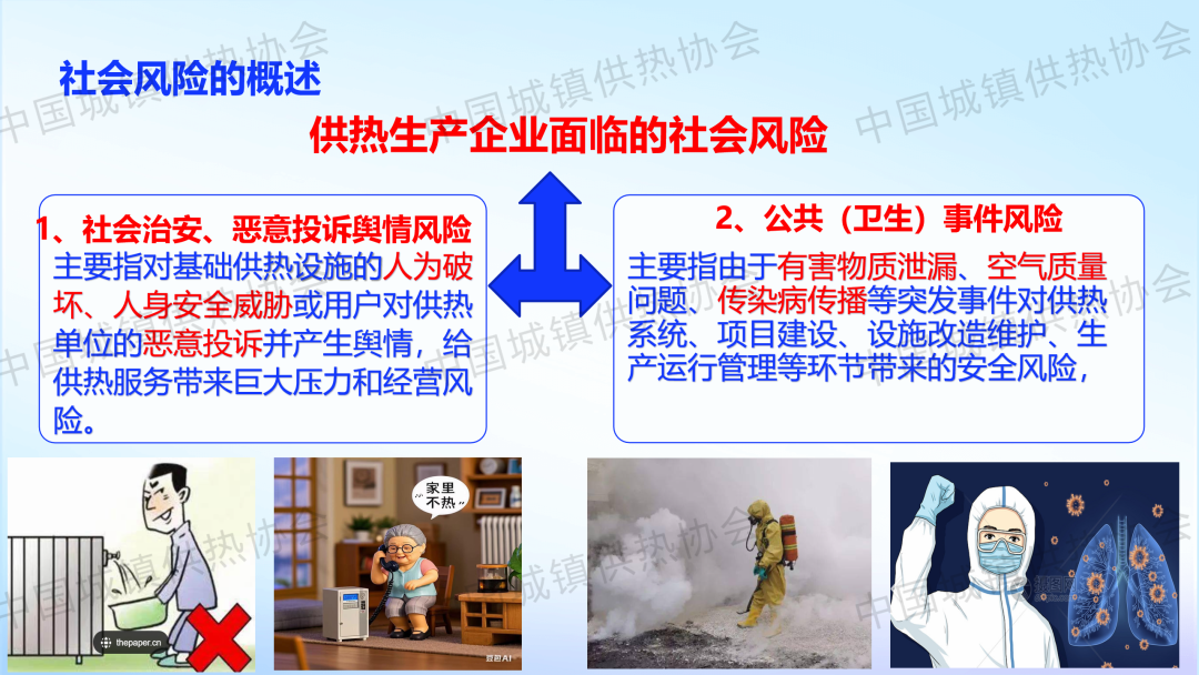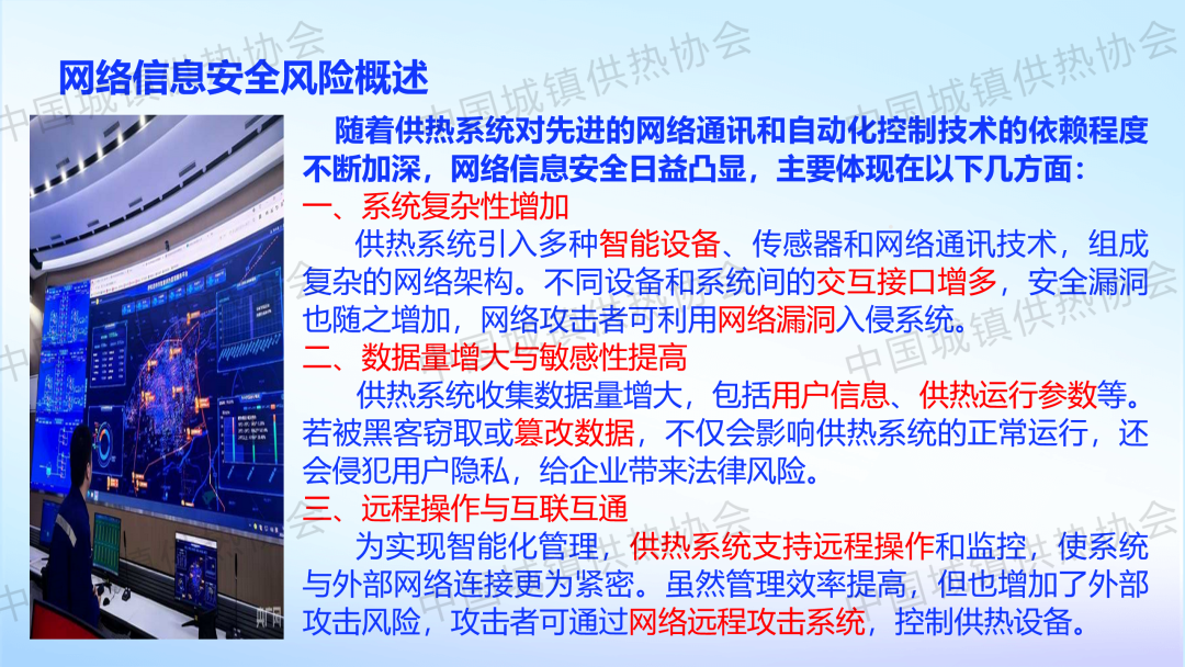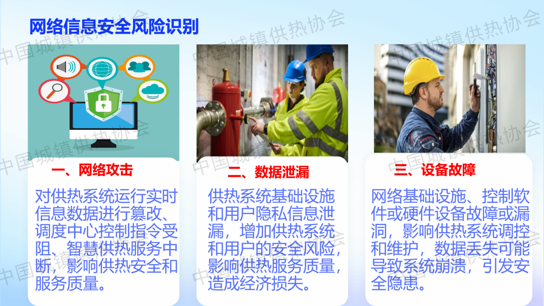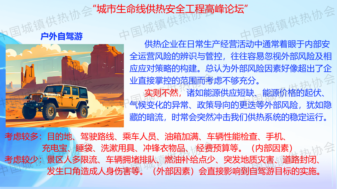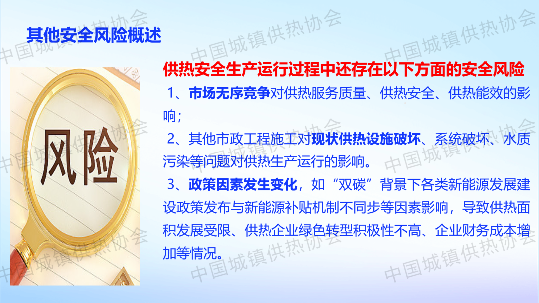 “供热生产安全运行风险识别与防范”主题论坛上,新疆乌鲁木齐热力集团公司安全管理部副部长涂新作了关于“供热生产企业外部风险识别及防范对策”的主题演讲,介绍了供热企业外部风险(能源风险、自然灾害风险、网络信息安全风险、社会风险、其他风险)的识别及防范对策。