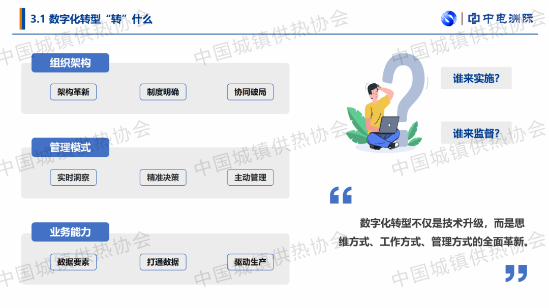 “大数据物联网赋能智慧供热”主题论坛上,中电洲际环保科技发展有限公司常务副总经理师文龙作了关于“热力企业私有云构建与数字化系统建设的实践探索”的主题演讲,分享了中电洲际数字化转型的实践探索。他提出数字化转型不仅仅是搭建平台,更是组织架构、管理模式、业务能力的转型,是一场深远的改革。