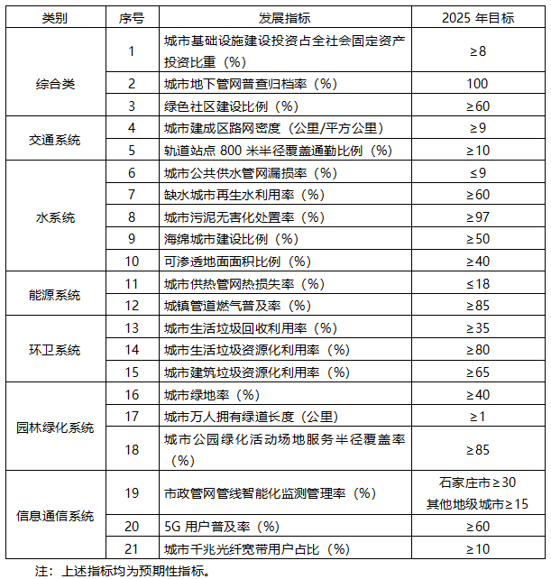 “十四五”期间,坚持问题导向和目标导向相结合,围绕系统化、绿色化、智慧化、品质化、低碳化,积极推进城市基础设施建设,全面提高城市基础设施运行效率,推进城市基础设施高质量发展。到2025年,全省燃气等老旧管道改造、排水管网雨污分流改造实现应改尽改,污水集中收集、污泥处置和垃圾焚烧处理设施实现全覆盖,城市综合交通设施水平显著提高,能源供应保障能力进一步增强,园林绿化品质持续改善,城市基础设施系统化水平、运行效率和防风险能力得到全面提升。
