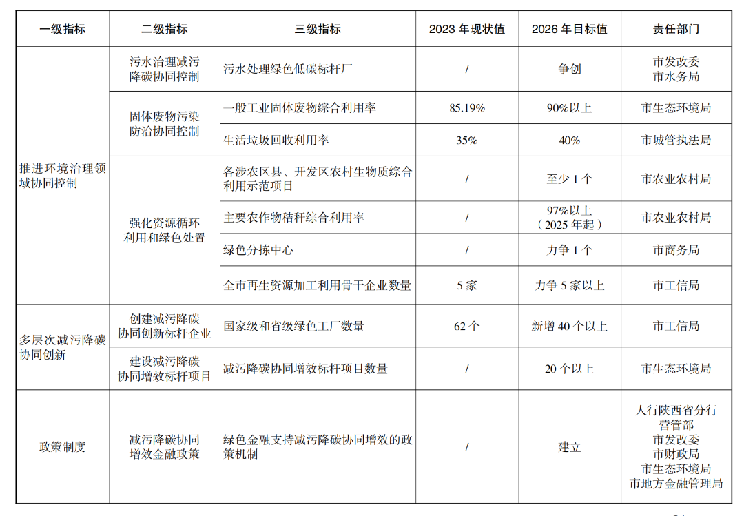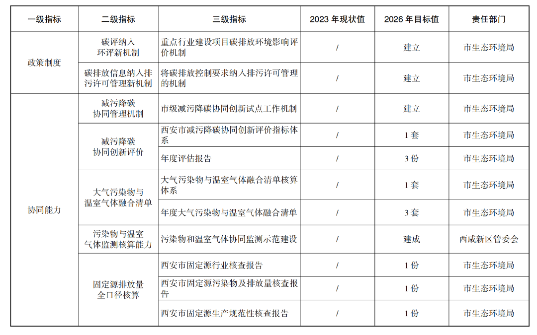 到2026年,形成一套减污降碳协同创新管理机制、模式路径和政策举措,构建“4+3+3+6”减污降碳协同创新“西安模式”,即开展能源、交通、工业、环境治理4个领域的减污降碳协同创新,在园区、企业、项目3个层次培育和遴选减污降碳协同创新标杆,出台减污降碳协同增效金融政策、碳评纳入环评新机制、碳排放信息纳入排污许可管理新机制3项减污降碳协同创新政策,提升市级层面试点工作机制创新、减污降碳协同创新评价指标体系创建、大气污染物与温室气体融合清单编制、污染物与温室气体监测核算、固定污染源排放量全口径核算、协同管理创新6种减污降碳协同管理和创新能力。投资约262亿元,推进66个减污降碳协同创新重点项目建设,确保全市非化石能源占能源消费比重达到22%以上,单位GDP能耗、主要污染物总量减排和单位GDP二氧化碳排放降低率完成省上下达目标。碳排放强度下降与生态环境质量改善协同推进取得明显成效,减污降碳协同度达到同类型城市领先水平,绿色低碳循环发展的经济体系初步形成。
