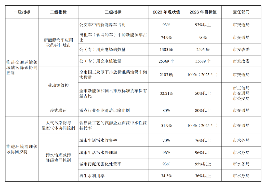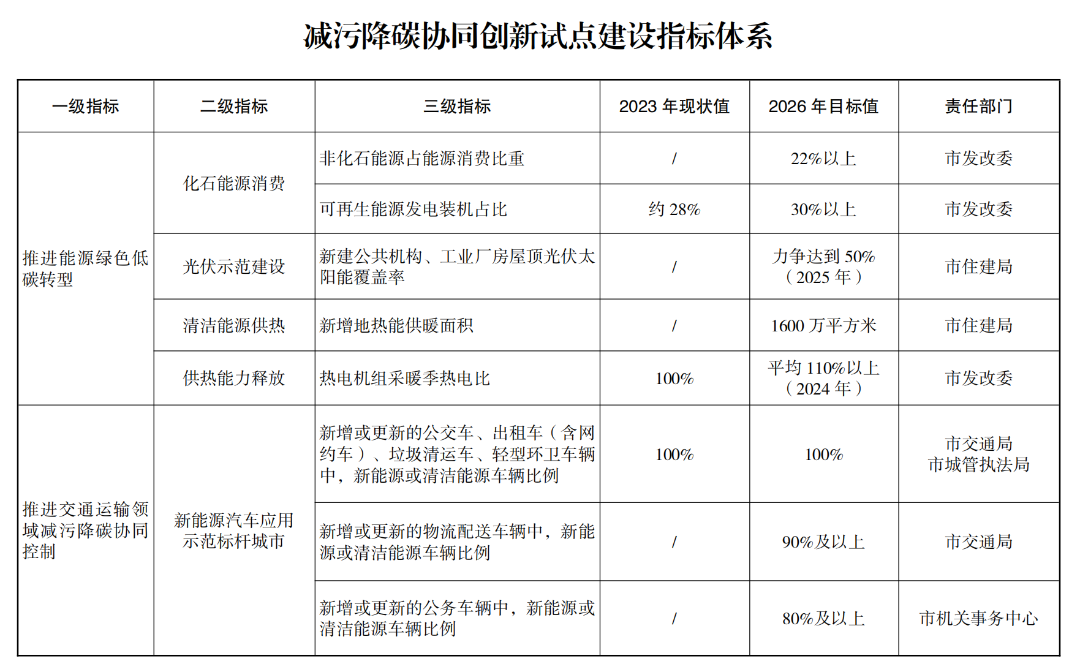 2025年度,持续推进新能源汽车应用示范标杆城市打造,以及能源、工业、交通、环境治理等领域减污降碳协同创新重点任务、重点项目的实施,全市减污降碳协同度有所提升。探索绿色金融支持减污降碳协同增效相关政策,探索建立将碳评纳入环评机制和碳排放控制要求纳入排污许可管理机制。将减污降碳协同创新试点考核纳入污染防治攻坚战考核。遴选第一期减污降碳协同创新典型。完成新能源或国六排放标准渣土车和商混车替代,完成含喷涂工艺的汽修企业面漆使用水性漆替代,完成23个重点项目。开展2025年减污降碳协同度评价和试点阶段性评估。
