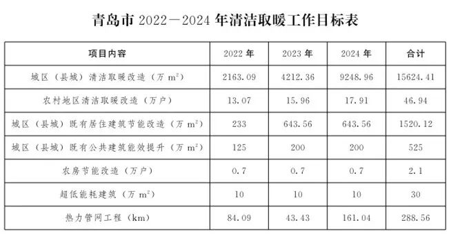 2022年9月23日,青岛市人民政府发布《青岛市冬季清洁取暖项目实施方案(2022-2024年)》。《实施方案》提出,2022-2024年,城区(县城)清洁取暖改造面积1.56亿平方米、农村地区清洁取暖改造46.94万户;城区(县城)既有公共建筑能效提升525万平方米、城区(县城)既有居住建筑节能改造1520.12万平方米、农房节能改造2.1万户、新建超低能耗建筑30万平方米;建设热力管网288.56公里。