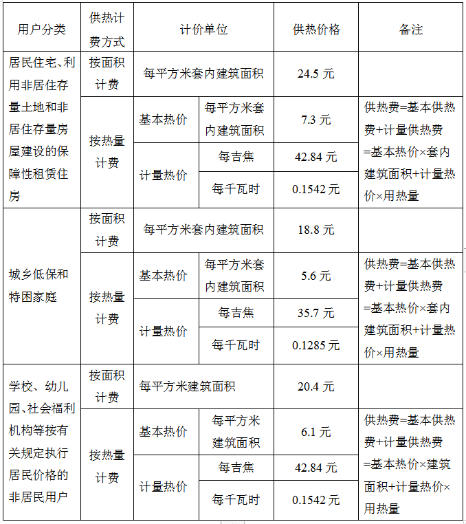 城乡社区居民委员会的工作场所及非经营公益服务设施,学校、幼儿园教学设施和学生生活服务设施,城乡居民住宅小区公共场所非经营性服务设施,托育、社会福利等机构,根据有关规定执行居民供热价格,按面积计费价格为每平方米建筑面积20.4元;实行两部制热价的,基本热价为每平方米建筑面积6.1元,计量热价为每吉焦42.84元(每千瓦时0.1542元)。