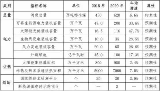 新建区域、新建建筑优先使用新能源和可再生能源,鼓励既有能源系统改造应用新能源和可再生能源,实现本地资源充分开发和外调绿电大幅消纳。到2020年,本市新能源和可再生能源开发利用总量达到620万t标准煤,较2015年增长35%以上,占全市能源消费总量的比例达到8%以上。