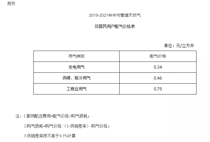 一、本市2019-2021年管道天然气非居民用户配气价格(不含购气损耗)自2019年5月1日执行,具体价格见附件。