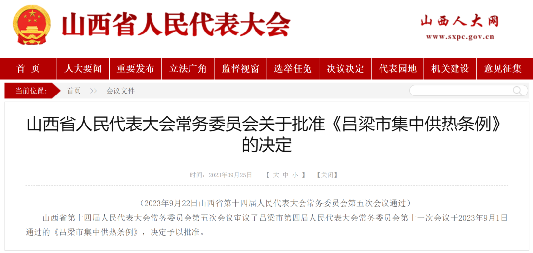 2023年9月22日山西省第十四届人民代表大会常务委员会第五次会议批准《吕梁市集中供热条例》。《条例》自2023年11月1日起施行。