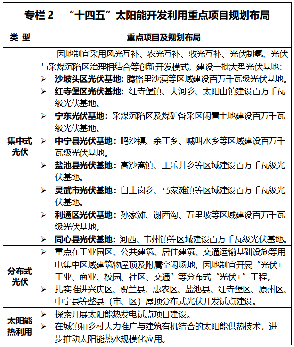 3.发展模式多元应用。建成中卫百万千瓦沙漠光伏电站、宝丰红墩子农光互补电站、贺兰通威渔光互补电站、闽宁镇光伏设施农业等“光伏+”项目,实现光伏发电与荒漠化治理、农业种植、旅游观光、水产养殖等综合发展。风光互补联合发电模式在中卫、吴忠等风光资源富集地区推广应用。嘉泽红寺堡新能源智能微电网列入国家示范项目。实施分散式风电、分布式光伏市场化交易试点项目,积极探索新能源就地消纳新模式。
