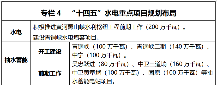 2.加快抽水蓄能电站开发。加快开工建设青铜峡、青铜峡二期、中宁等抽水蓄能电站,力争“十四五”期间完成青铜峡抽水蓄能电站库体工程。积极推进吴忠跃进抽水蓄能电站前期工作,扎实开展抽水蓄能中长期规划储备项目研究论证,因地制宜开展中小型抽水蓄能研究。