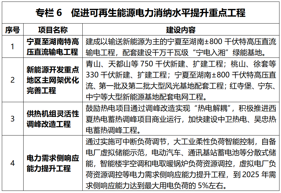 2.推动可再生能源更大范围优化配置。全面落实国家重大战略部署,建成以新能源外送为主的宁夏至湖南±800千伏特高压直流输电工程,全面形成向华北、华东、华中直流送电格局,进一步扩大我区新能源开发和电力外送规模,促进新能源更大范围优化消纳,加快能源资源优势向经济优势转化。