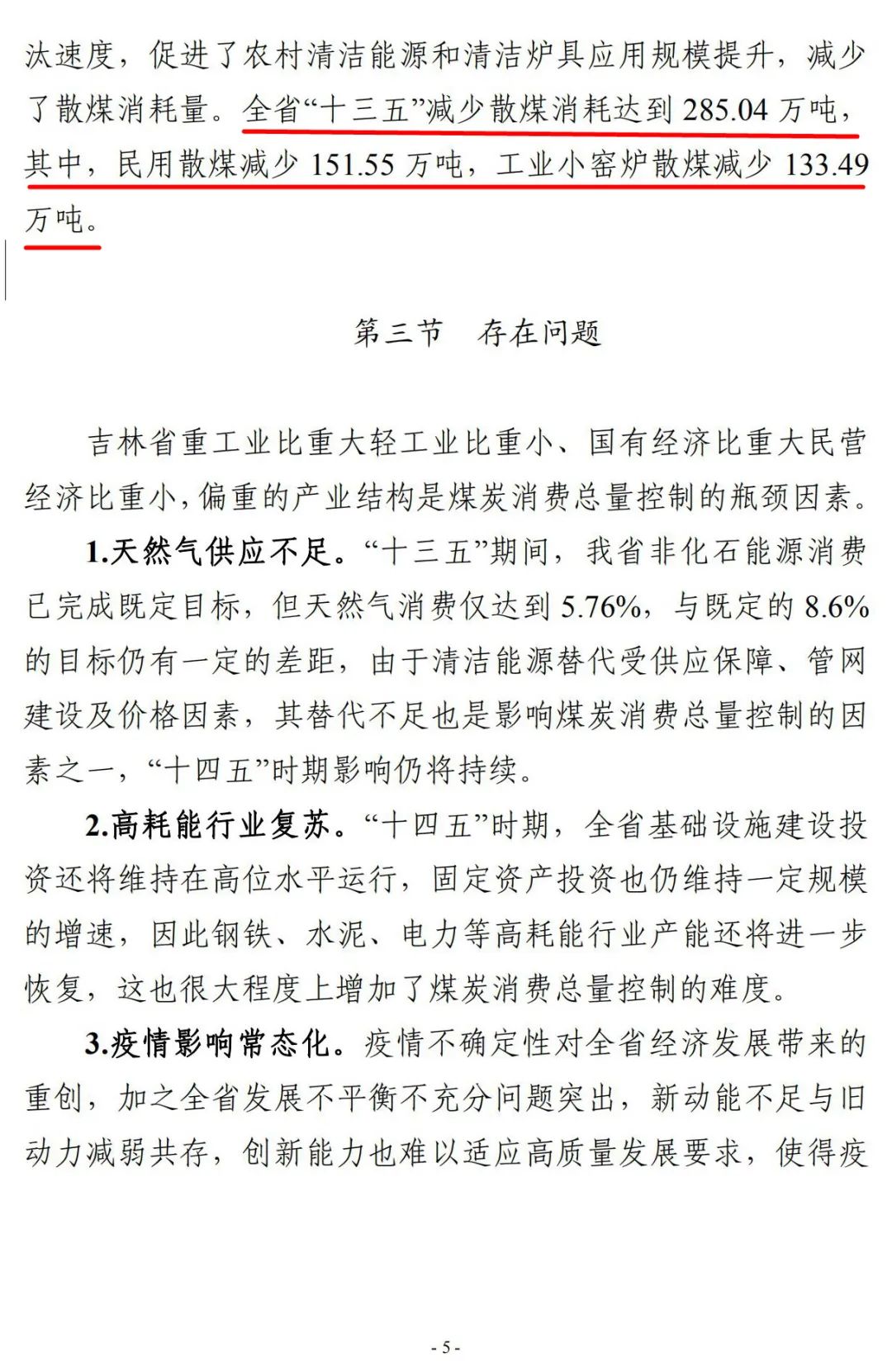 2022年11月30日,吉林省能源局发布《吉林省煤炭消费总量控制“十四五”规划》。《规划》显示,“十三五”期间,全省城镇集中供热率由75%提高到95%,单位建筑面积供暖能耗由20kgce/㎡降低至18kgce/㎡。全省城镇供暖建筑面积由6.01亿㎡提高到8.06亿㎡,供暖能耗占比由21.21%上升到29.30%,8.09%的供暖能耗占比增长支撑了25.4%供暖需求增长。减少散煤消耗达到285.04万吨,其中,民用散煤减少151.55万吨。工业小窑炉散煤减少133.49万吨。