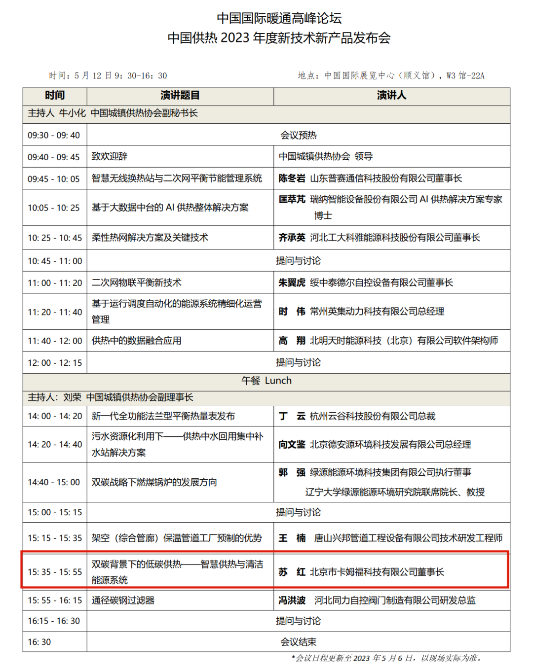 2023中国供热展将于2023年5月11日-13日在北京中国国际展览中心(顺义馆)召开。中国城镇供热协会将于5月12日W3馆-22A举办中国供热2023年度新技术新产品发布会。