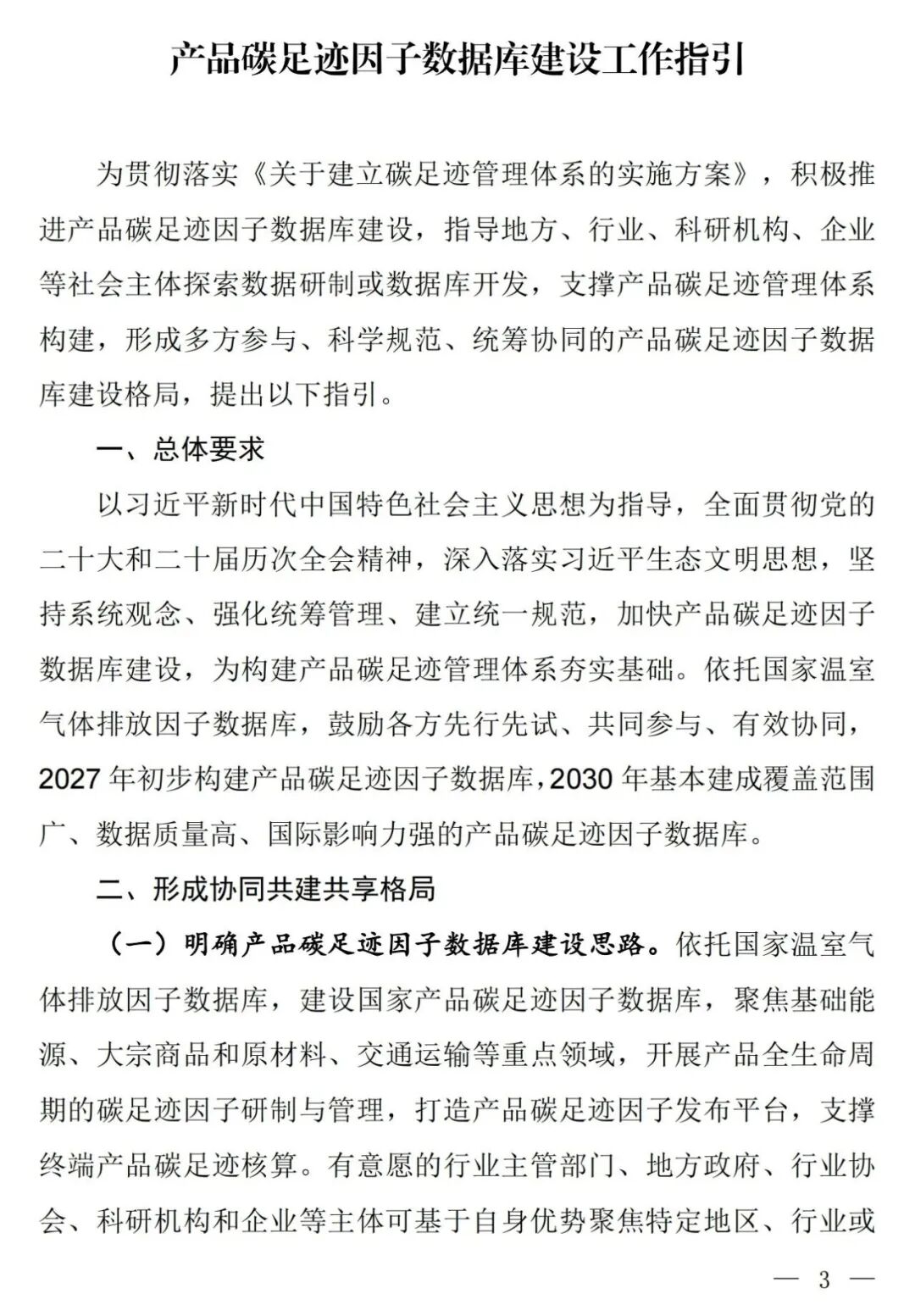 为深入贯彻党的二十大和二十届历次全会精神,落实《关于建立碳足迹管理体系的实施方案》要求,积极推进产品碳足迹因子数据库建设,指导地方、行业、科研机构、企业等社会主体探索数据研制或数据库开发,生态环境部会同国家发展改革委、工业和信息化部、住房城乡建设部、交通运输部、市场监管总局、国家数据局制定了《产品碳足迹因子数据库建设工作指引》,现印发给你们,请结合实际抓好落实。
