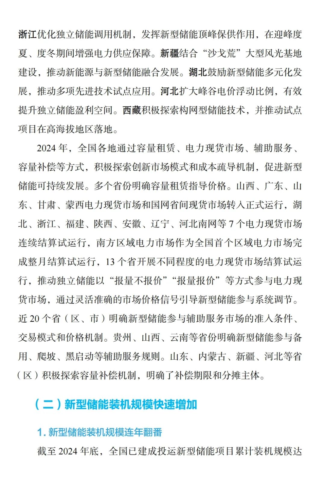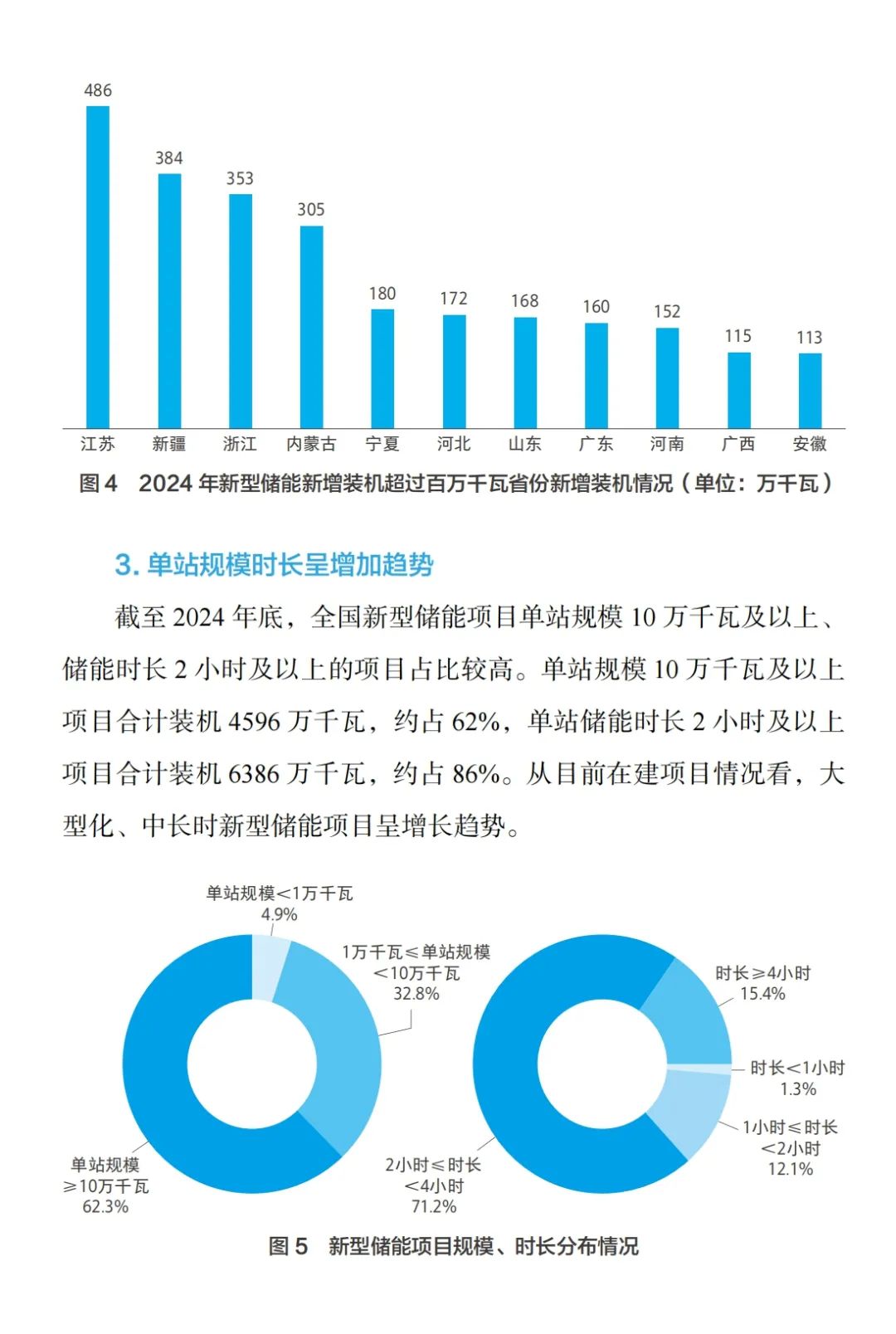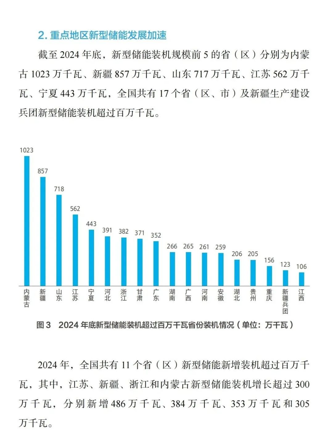 从地域上看,截至2024年底,新型储能装机规模前5的省(区)分别为内蒙古1023万千瓦、新疆857万千瓦、山东717万千瓦、江苏562万千瓦、宁夏443万千瓦,全国共有17个省(区、市)及新疆生产建设兵团新型储能装机超过百万千瓦。