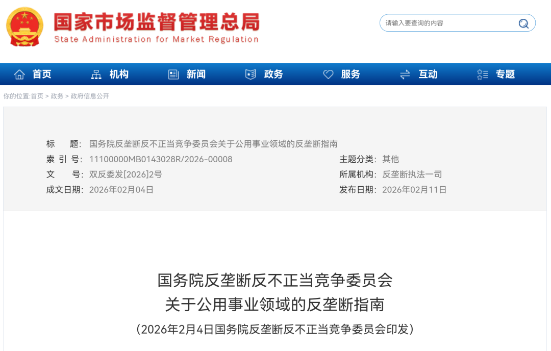 2026年2月4日,国务院反垄断反不正当竞争委员会印发施行《关于公用事业领域的反垄断指南》(以下简称《指南》)。《指南》在总结执法经验的基础上,对瓶装液化气等行业出现较多的垄断协议行为,以及供水、供电、供气、供热等行业出现较多的限定交易、搭售和附加其他不合理交易条件等滥用市场支配地位行为,均进一步细化表现形式。