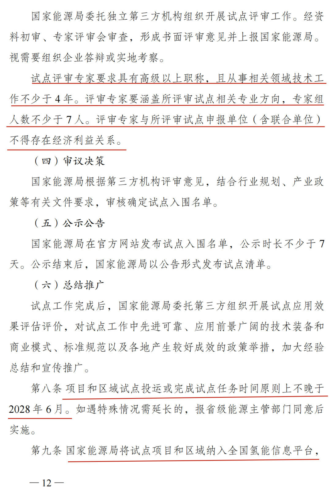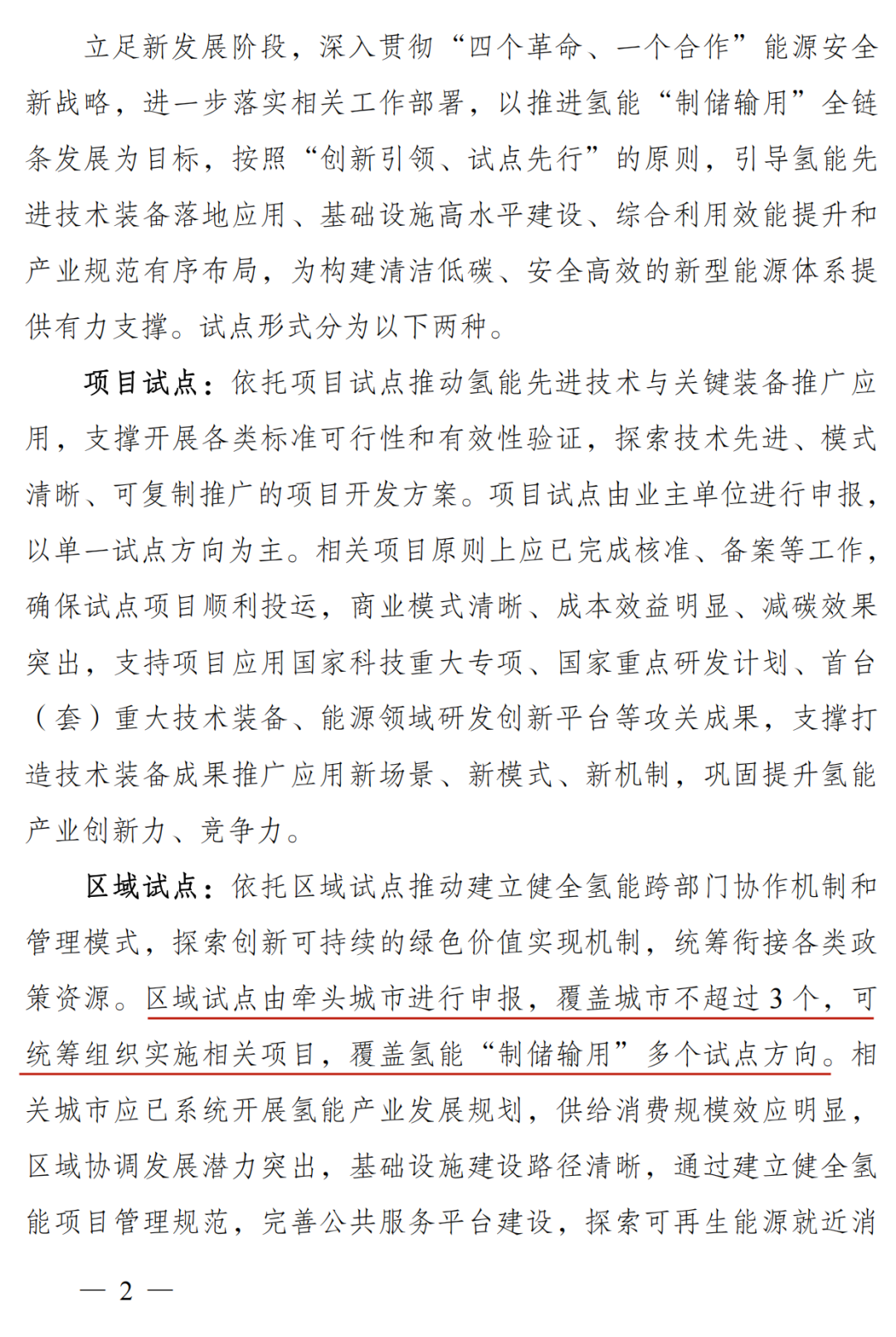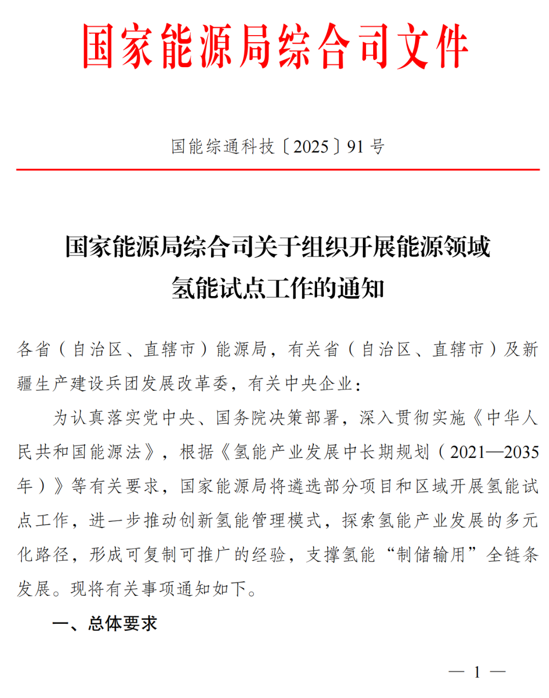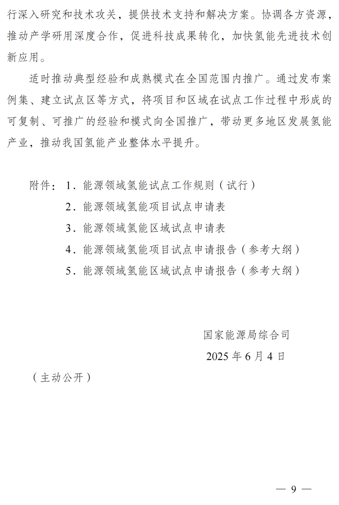 2025年6月10日,国家能源局发布《关于组织开展能源领域氢能试点工作的通知》,将遴选部分项目和区域开展氢能试点工作,进一步推动创新氢能管理模式,探索氢能产业发展的多元化路径,形成可复制可推广的经验,支撑氢能“制储输用”全链条发展。项目和区域试点原则上在3年内建成投产或完成试点任务。