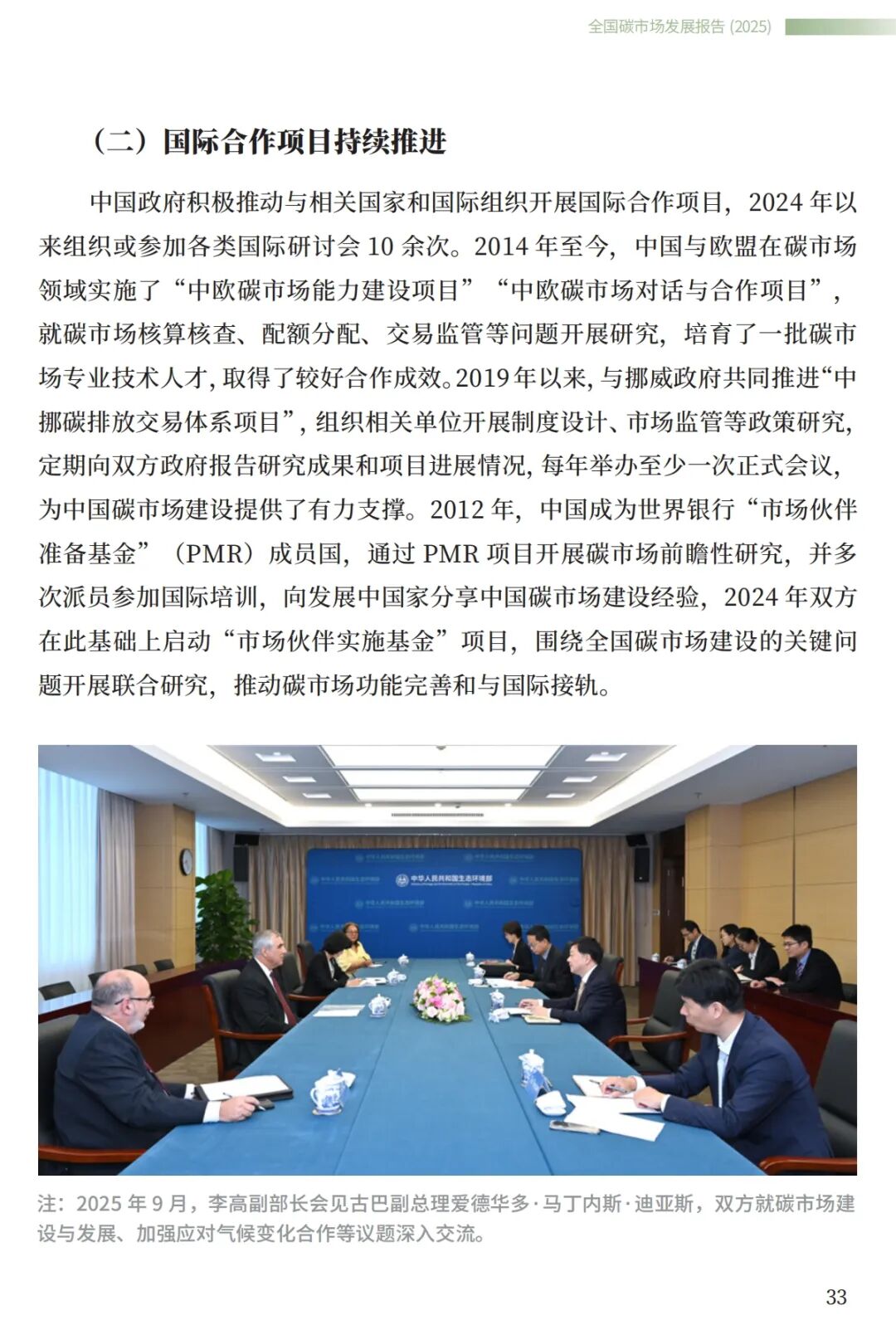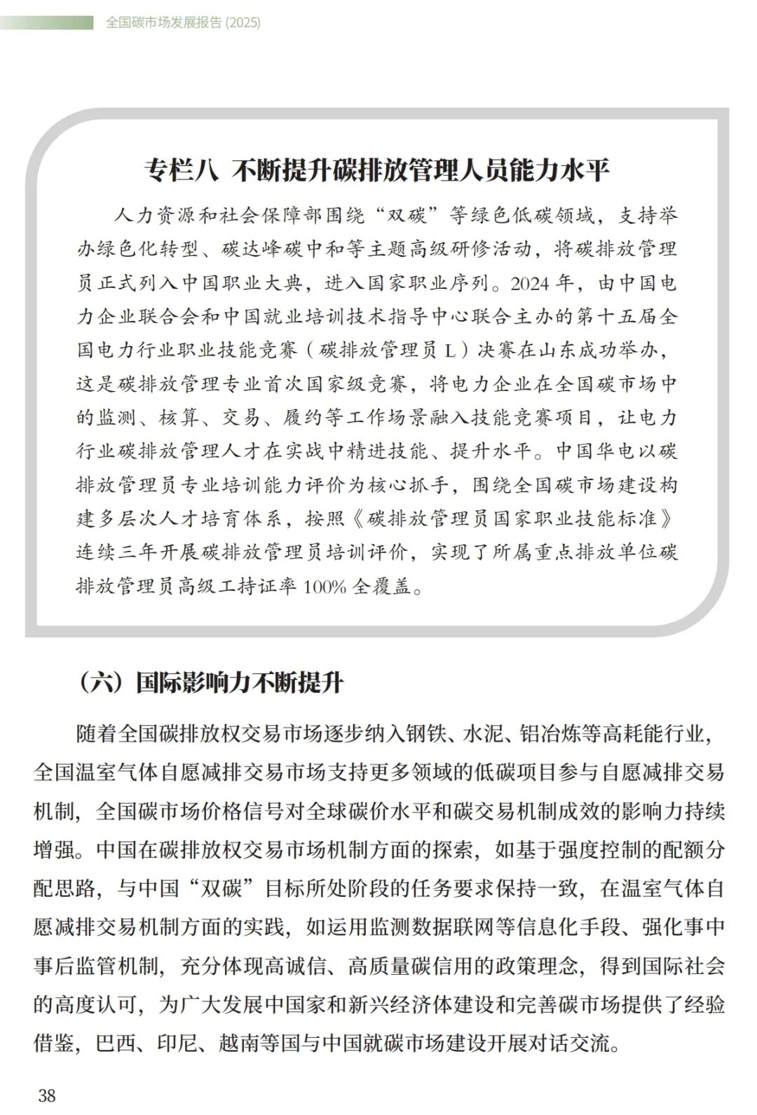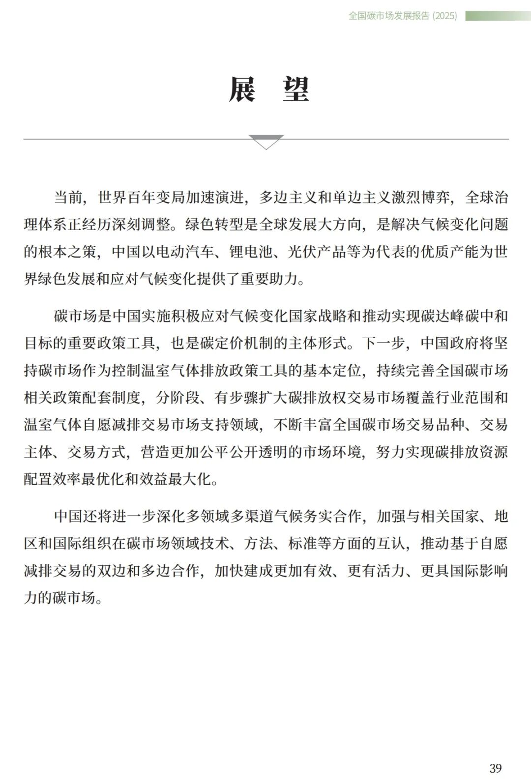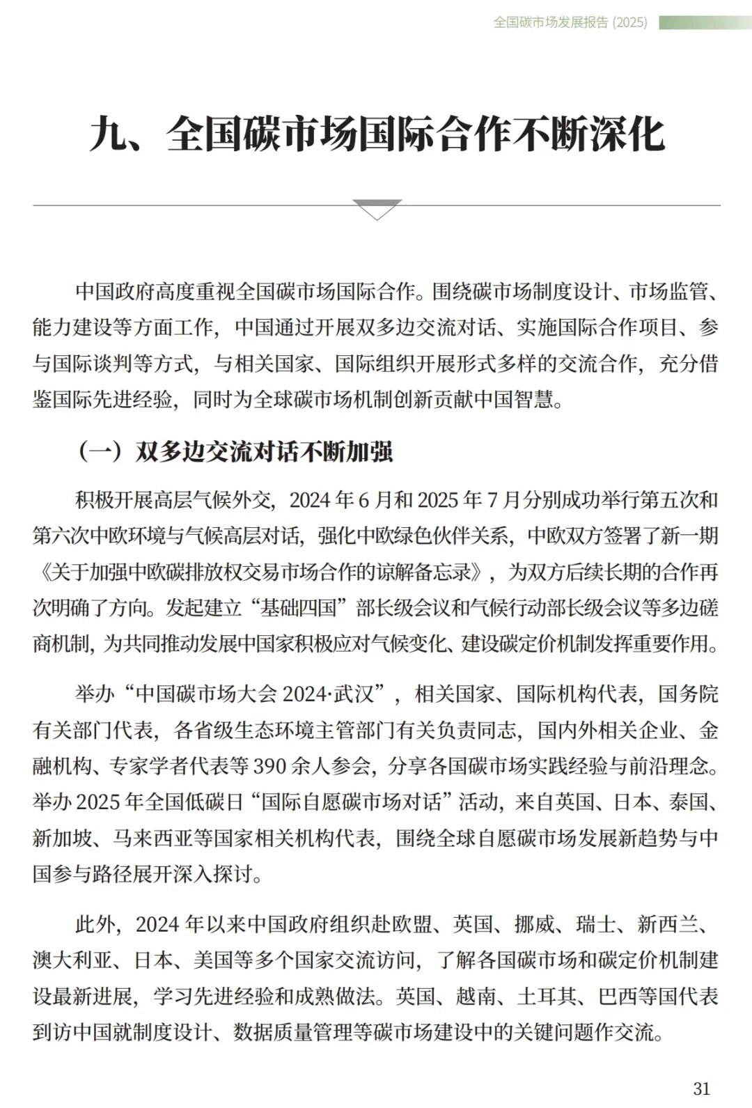 《报告》提出,中国将进一步深化多领域多渠道气候务实合作,加强与相关国家、地区和国际组织在碳市场领域技术、方法、标准等方面的互认,推动基于自愿减排交易的双边和多边合作,加快建成更加有效、更有活力、更具国际影响力的碳市场。