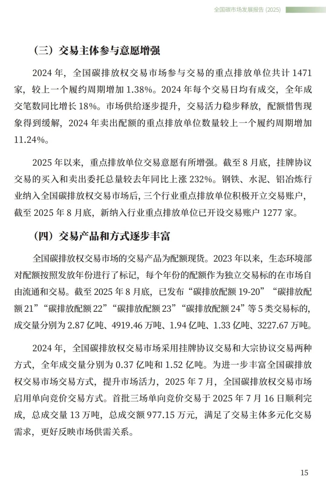 9月27日,国家生态环境部发布《全国碳市场发展报告(2025)》,系统总结了全国碳排放权交易市场和全国温室气体自愿减排交易市场的最新建设进展,全方位展示了市场建设运行成效,展望了全国碳市场未来发展方向。