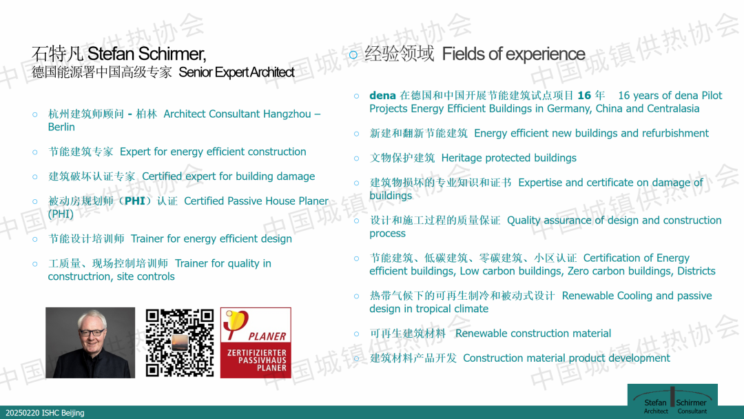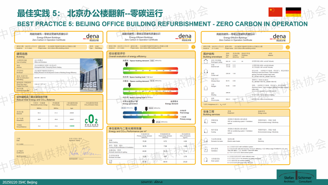 德国能源署前中国高级专家Stefan Schirmer(石特凡)作了题为“零碳建筑之路——中国的最佳实践”的演讲,介绍了运行阶段的零碳建筑标准、建筑一体化光伏技术,并分享了我国的实践案例。