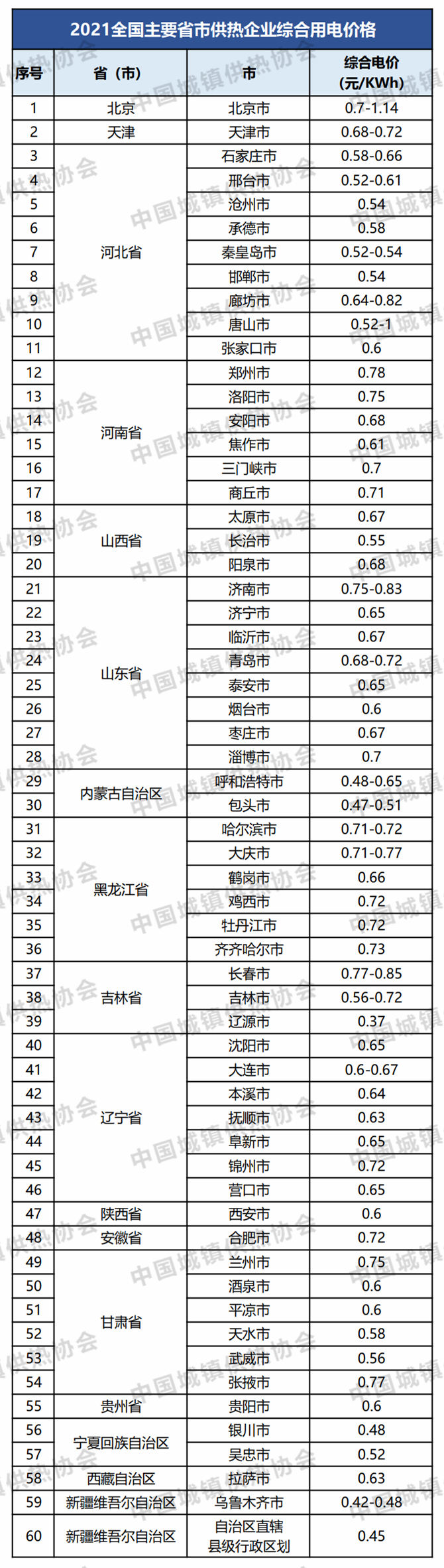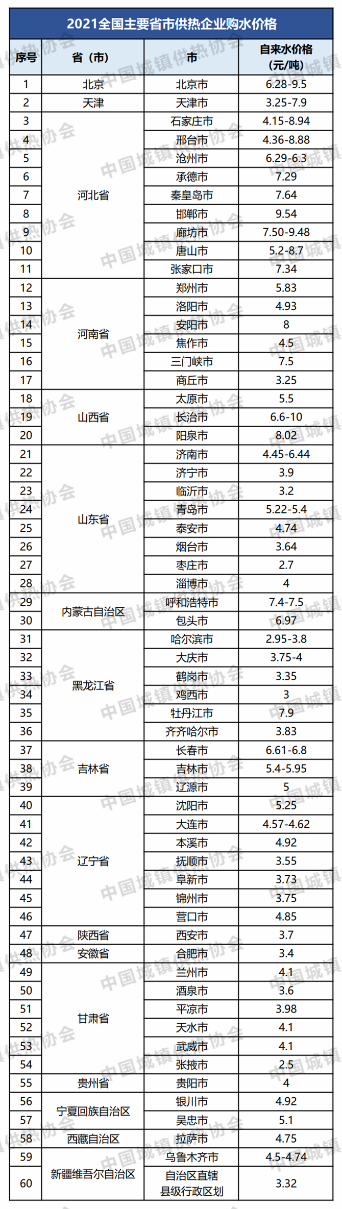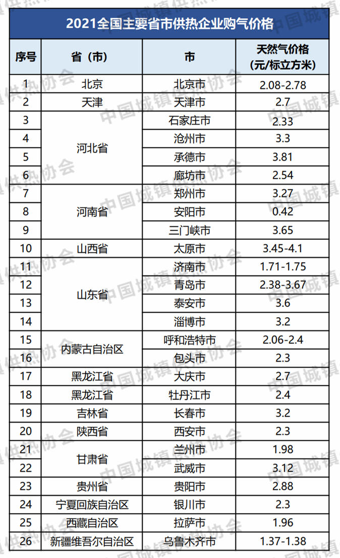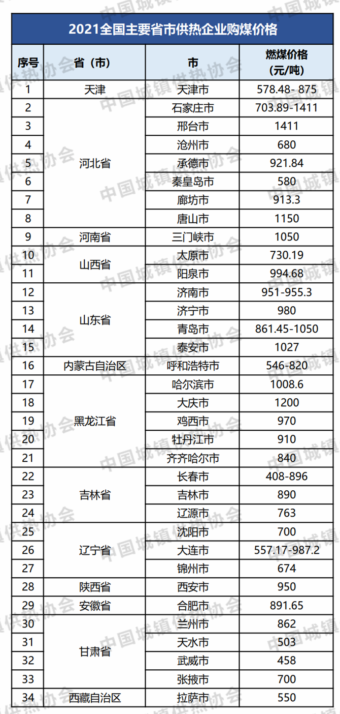 根据协会2021年全国部分供热企业统计工作结果,现摘取各地2020-2021供暖期各地供热企业综合购气、购煤、购水、购电价格,予以公布。
