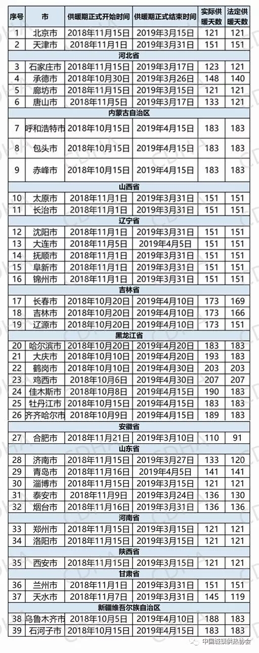 全国主要省市供热起止时间