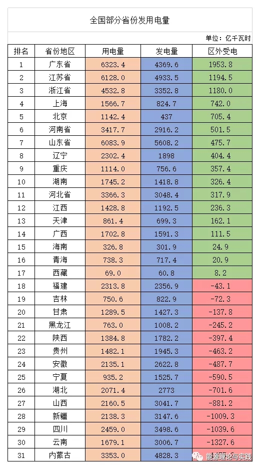 从各省(市)发用电量看,电力资源分布与需求呈逆向分布特征明显,2018年各省区外受电量总和8723亿千瓦时,占当地总发电量20.4%。广东、江苏、山东省用电量位居前三,山东、江苏、内蒙古发电量位居前三,广东、江苏、浙江省区外受电量位居前三,北京、上海、重庆区外受电占用电量的比重位居前三。