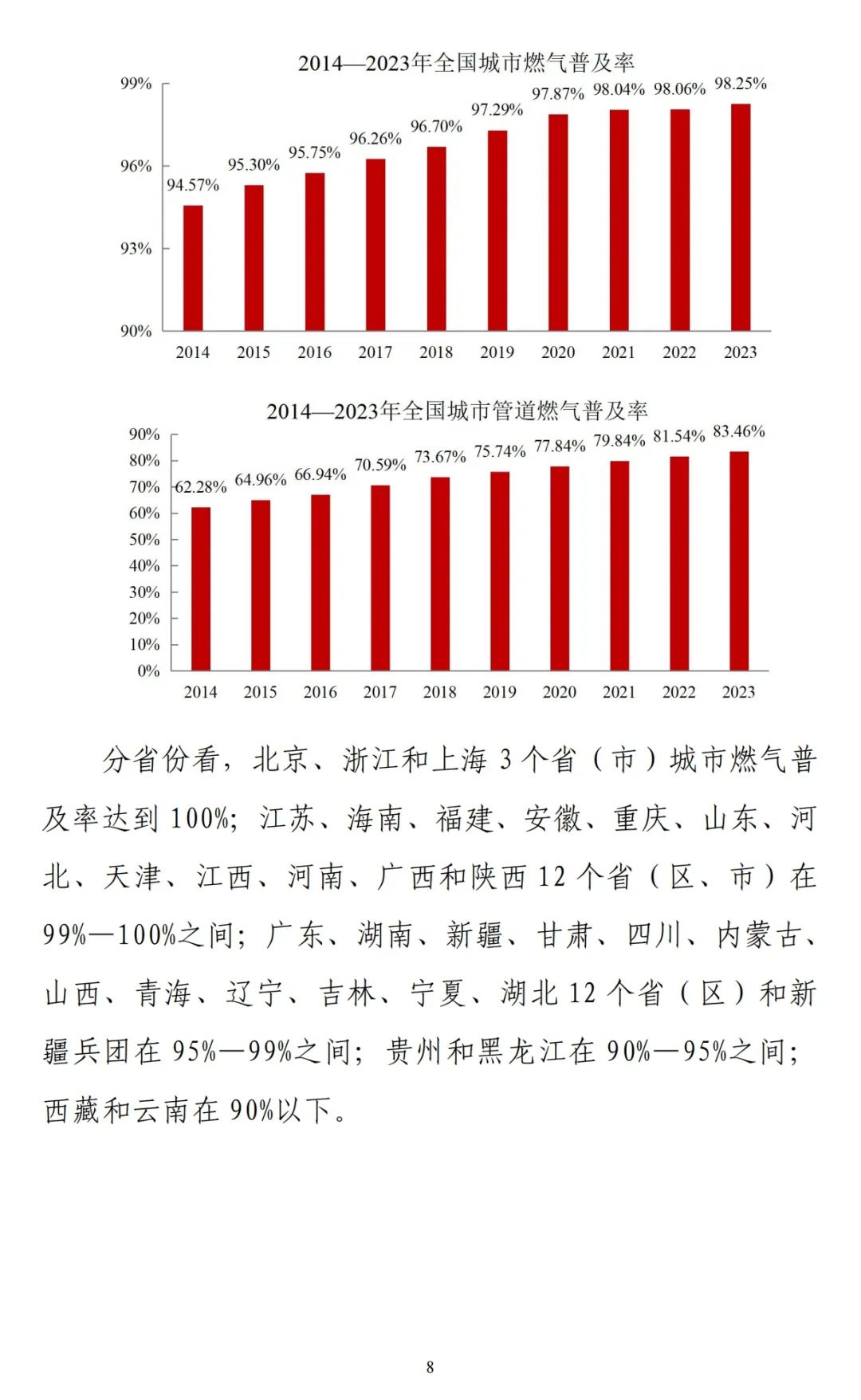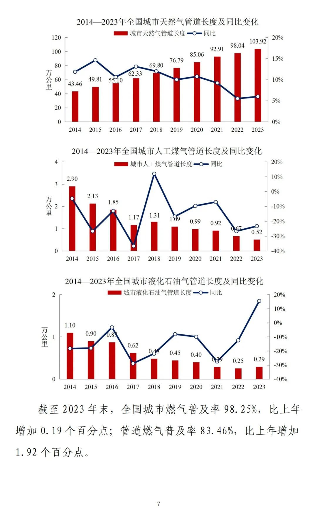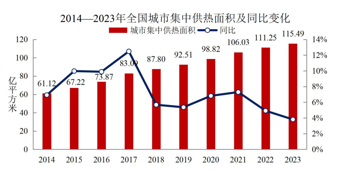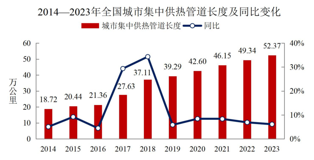 《公报》数据显示,截至2023年末,全国城市集中供热面积115.49亿平方米,同比增长3.81%;集中供热管道长度52.37万公里,同比增长6.13%;全国城市蒸汽集中供热能力12.39万吨/小时,同比下降1.30%;热水集中供热能力63.12万兆瓦,同比增长5.17%。