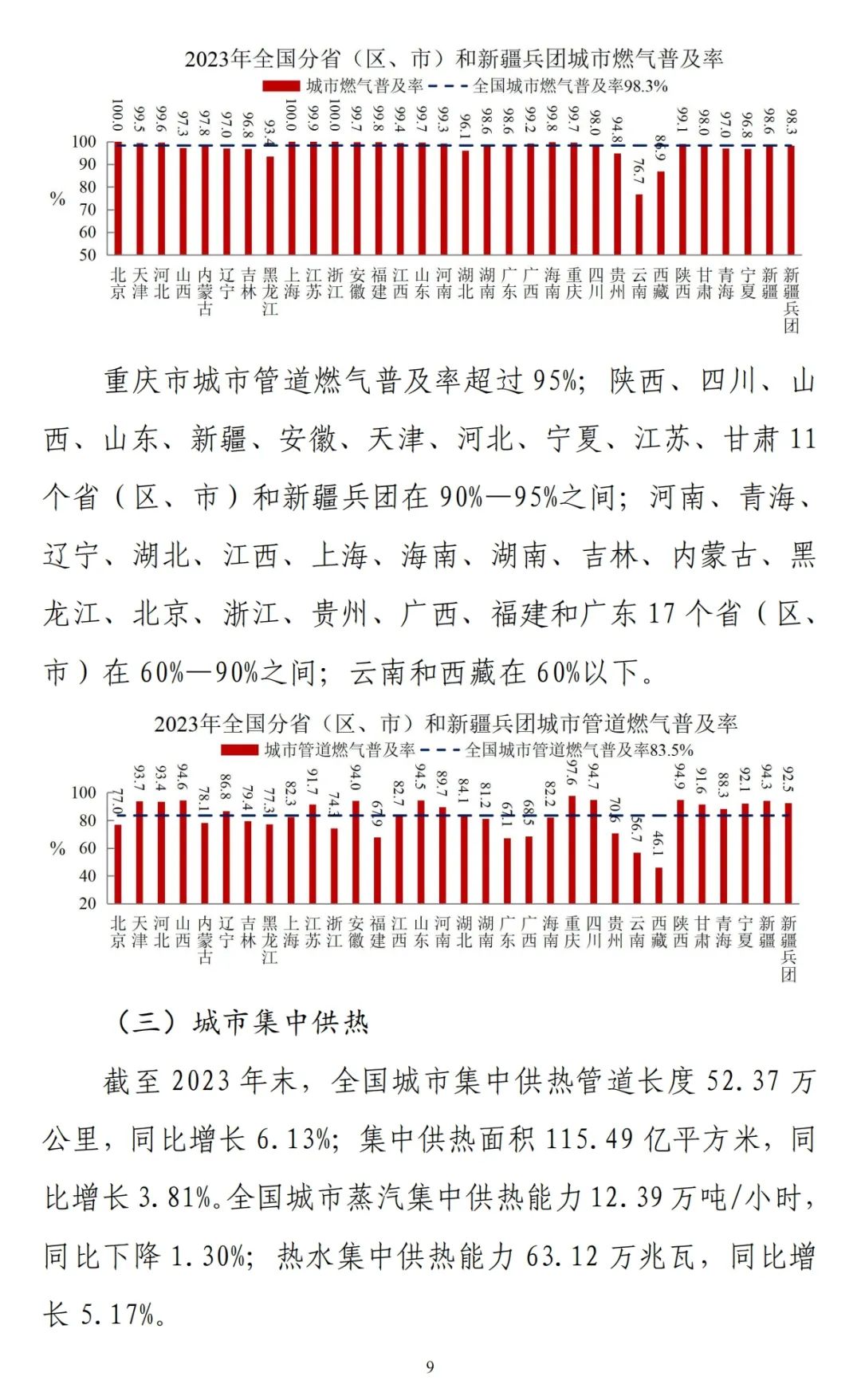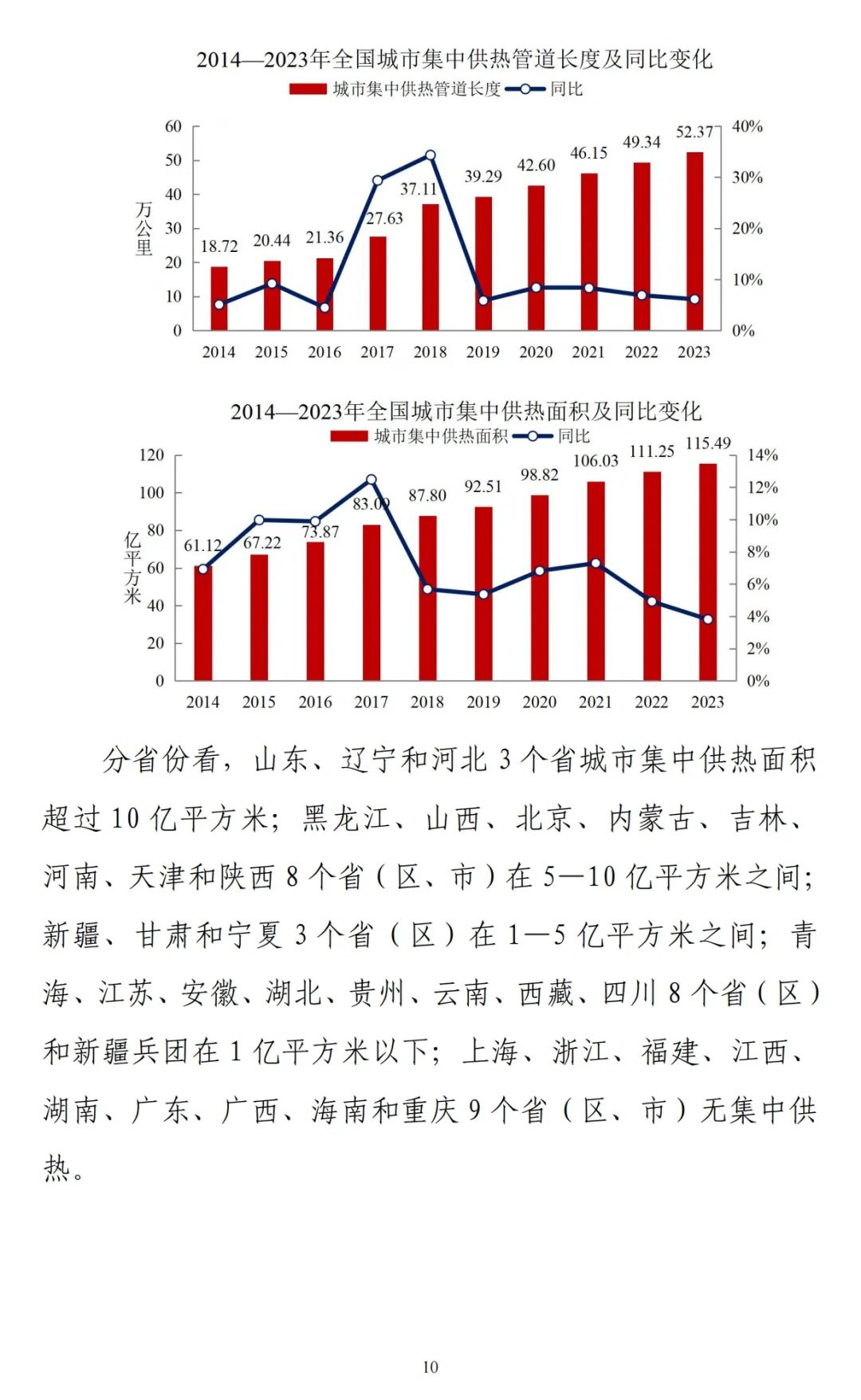分省份看,山东、辽宁和河北3个省城市集中供热面积超过10亿平方米;黑龙江、山西、北京、内蒙古、吉林、河南、天津和陕西8个省(区、市)在5-10亿平方米之间;新疆、甘肃和宁夏3个省(区)在1-5亿平方米之间;青海、江苏、安徽、湖北、贵州、云南、西藏、四川8个省(区)和新疆兵团在1亿平方米以下;上海、浙江、福建、江西、湖南、广东、广西、海南和重庆9个省(区、市)无集中供热。