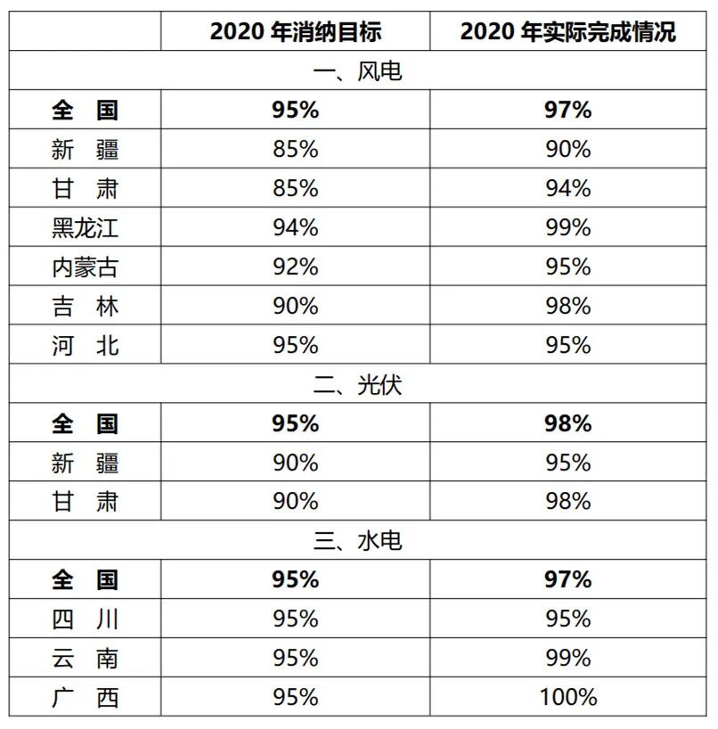 根据2018年国家发展改革委、国家能源局印发的《清洁能源消纳行动计划(2018-2020年)》(发改能源规〔2018〕1575号),所确定的分年度风电、光伏和水电消纳目标,2020年全国平均风电利用率97%,超过2020年风电利用率目标2个百分点,重点省区全部达到了2020年消纳目标;全国平均光伏发电利用率为98%,超过2020年利用率目标3个百分点,重点省区全部达到了2020年消纳目标;全国主要流域水能利用率97%,超过2020年利用率目标近2个百分点,重点省区全部达到了2020年消纳目标。