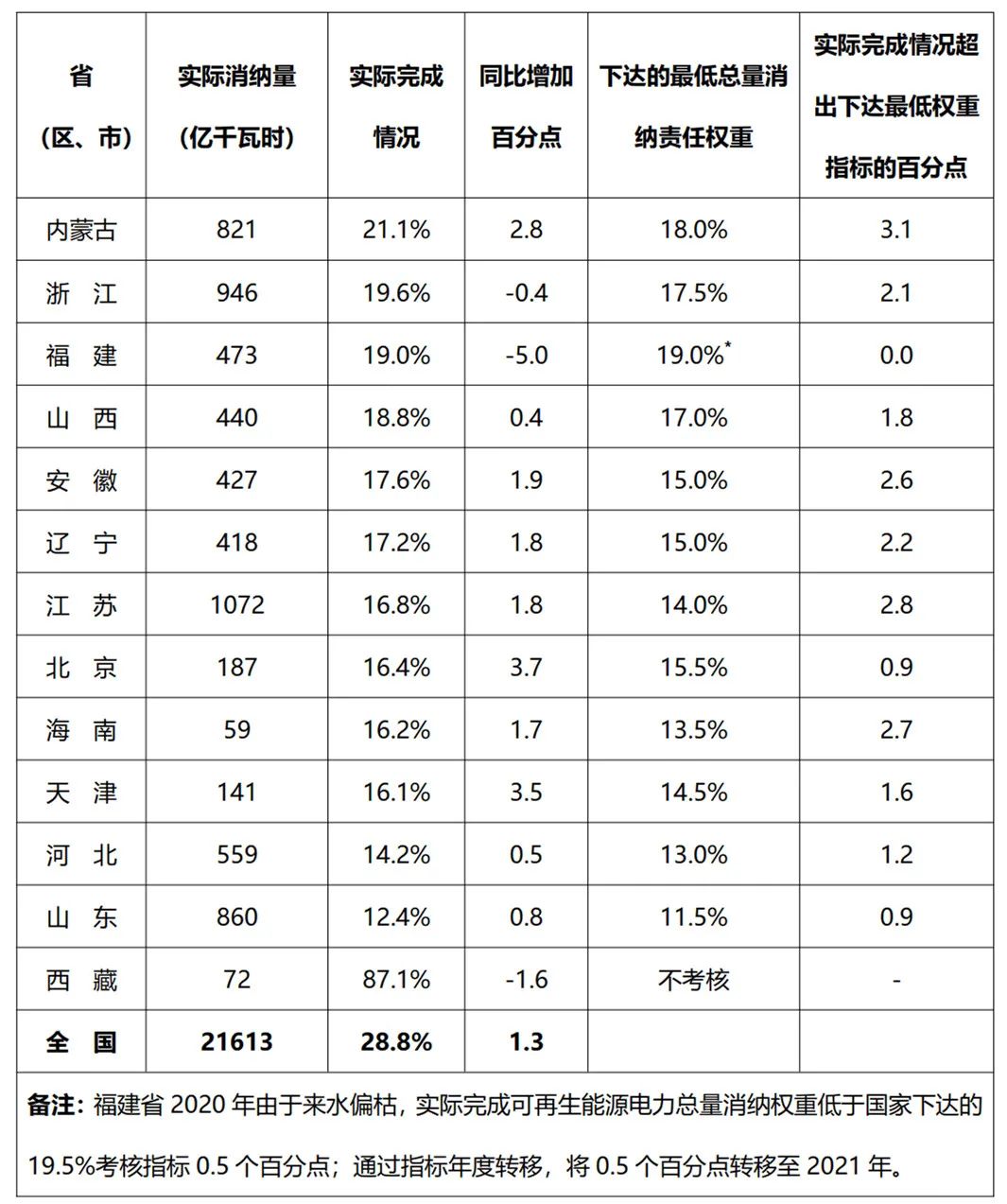 根据《国家发展改革委 国家能源局关于印发各省级行政区域2020年可再生能源电力消纳责任权重的通知》(发改能源〔2020〕767号)公布的2020年各省(区、市)可再生能源电力消纳责任权重,综合考虑各省本地生产、本地利用以及外来电力消纳情况,经核算,除西藏免除考核外,全国30个省(区、市)都完成了国家能源主管部门下达的总量消纳责任权重和非水电消纳责任权重。