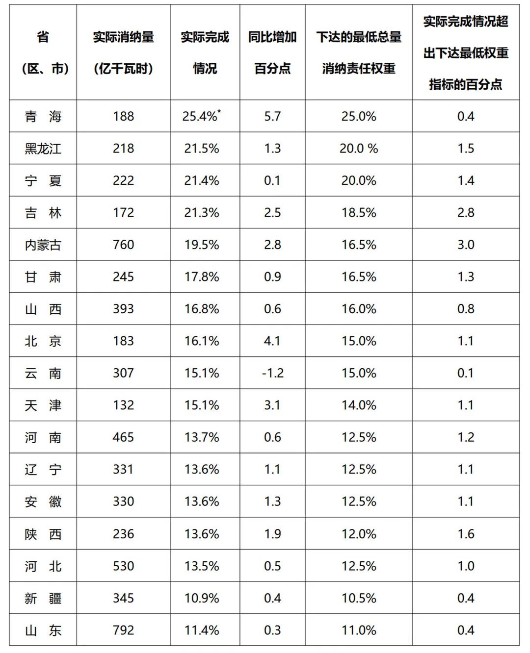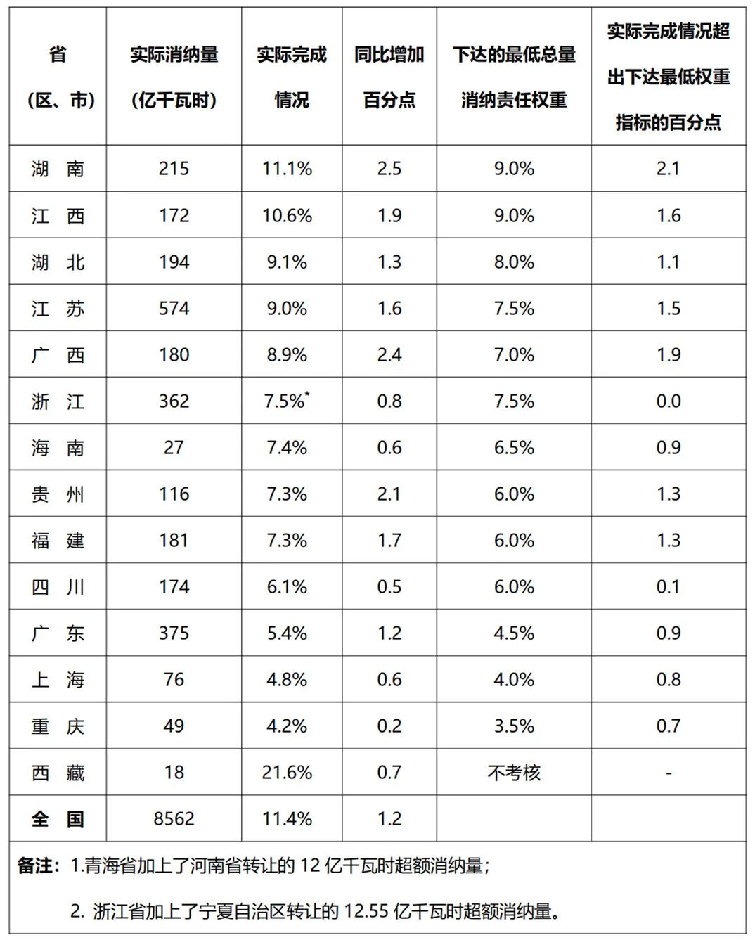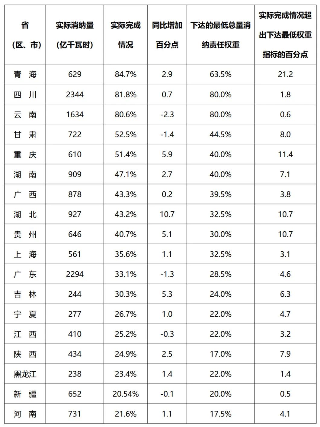 二、各省(区、市)可再生能源电力消纳责任权重完成情况