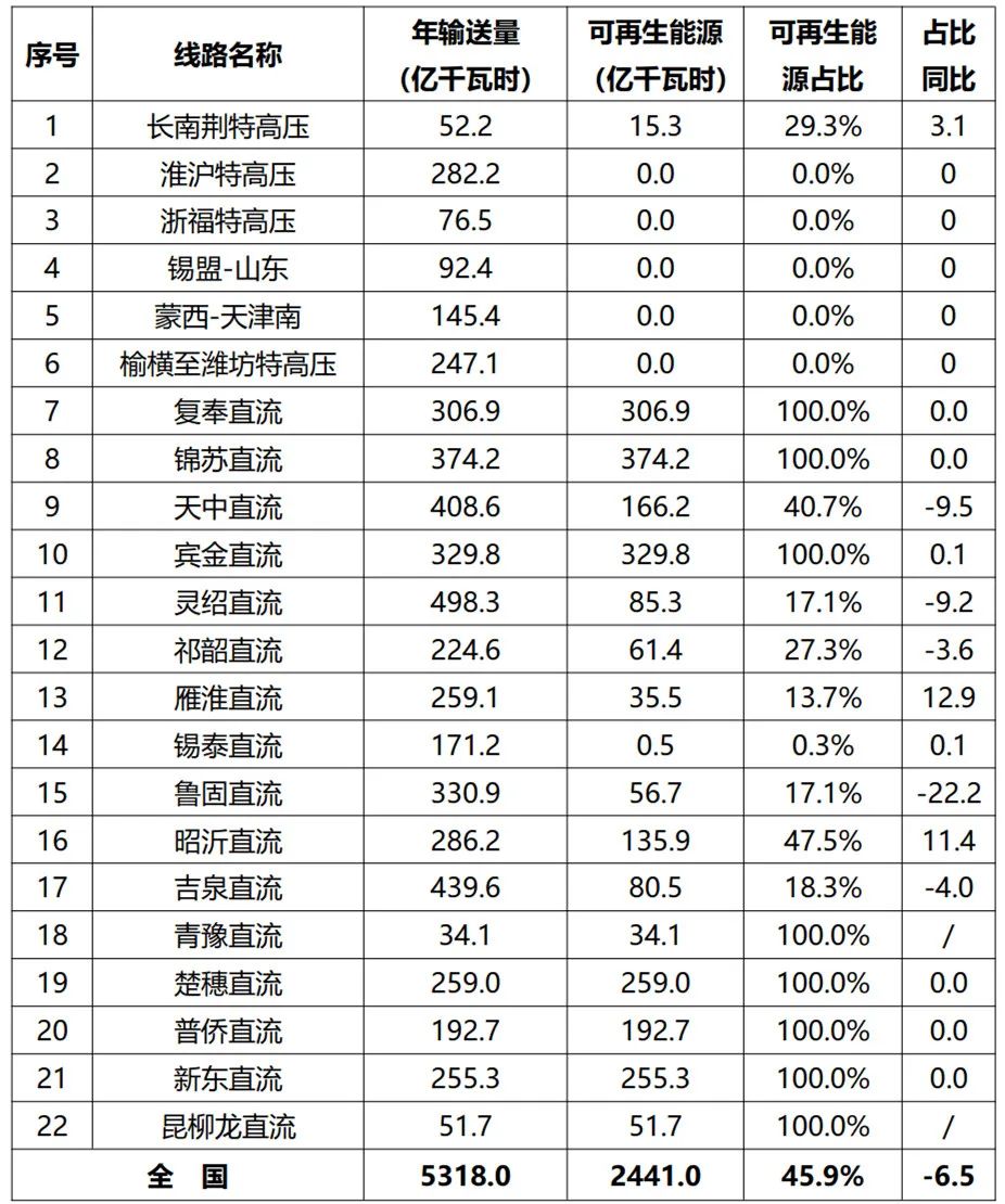 2020年,22条特高压线路年输送电量5318亿千瓦时,其中可再生能源电量2441亿千瓦时,同比提高3.8%,可再生能源电量占全部输送电量的45.9%。国家电网运营的18条特高压线路输送电量4559亿千瓦时,其中可再生能源电量1682亿千瓦时,占输送电量的37%;南方电网运营的4条特高压线路输送电量759亿千瓦时,全部为可再生能源电量。