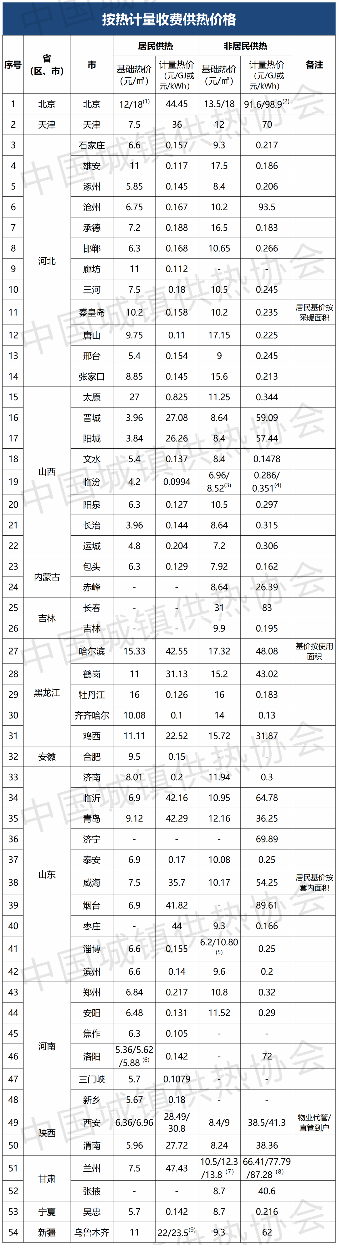(9)乌鲁木齐市居民和非居民计量价:到楼栋22元/GJ,到户23.5元/GJ。