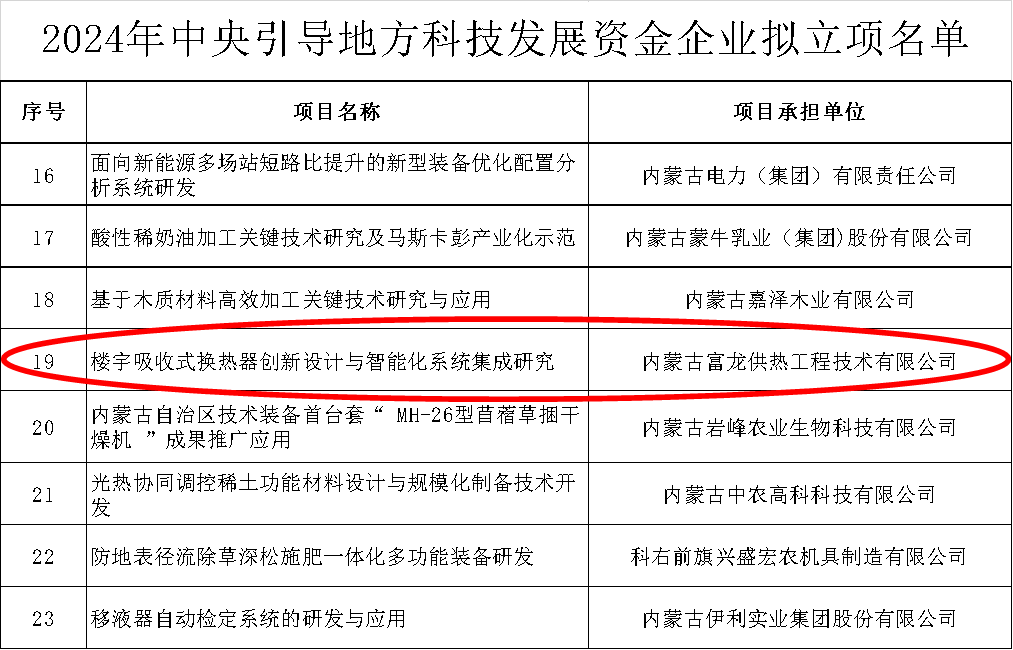 9月3日,内蒙古自治区科学技术厅公布2024年度中央引导地方科技发展资金拟立项项目名单,内蒙古富龙供热工程技术有限公司《楼宇吸收式换热器创新设计与智能化系统集成研究》项目入选,获得50万元财政定额补助。