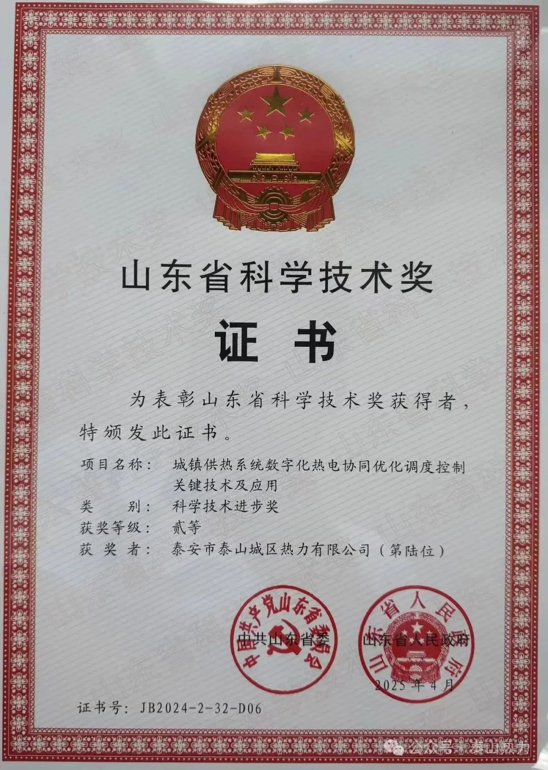近日,山东省科技大会在济南召开,泰安市泰山城区热力有限公司参与完成的《城镇供热系统数字化热电协同优化调度控制关键技术及应用》项目获得山东省科学技术进步二等奖。