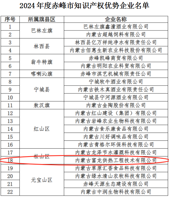 赤峰市市场监督管理局发布2024年度赤峰市知识产权优势企业评审结果,内蒙古富龙供热工程技术有限公司成功入选。