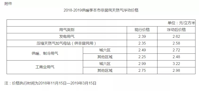《通知》规定:2018年11月15日至2019年3月15日,本市非居民用天然气销售价格上浮0.23元/立方米。其他时间按照北京市发展和改革委员会《关于调整本市非居民天然气销售价格的通知》(京发改〔2018〕1356号)规定的价格标准执行。