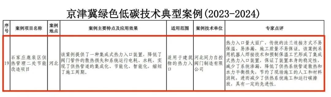 北京节能环保中心关于发布《京津冀绿色低碳技术典型案例(2023-2024)》的通知,河北同力申报的“石家庄鹿泉区供热管理二处节能改造项目”因其使用的集成式热力入口装置降低了阀门管件的散热损失和系统运行电耗、水耗,实现了供热管道的集成化、节能化、智能化,缩短了施工周期,成功入选并作为典型案例得到了重点推广。