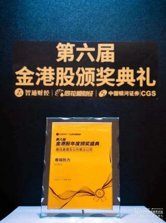 2022年1月11日,备受海内外资本市场瞩目的“全球投资趋势论坛暨第六届金港股颁奖典礼”在深圳隆重举行,来自金融、通信、互联等各领域的2478家港股主板上市公司参与报名评选。经过激烈角逐,春城热力凭借强劲的企业发展势头和出色的业态发展板块成功荣获“最佳基建及公共事业公司”大奖,成为东北地区唯一获此殊荣的热力上市公司。