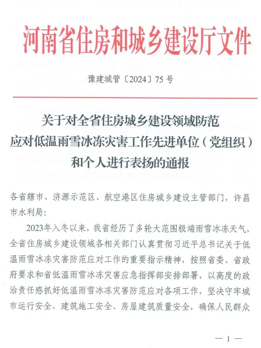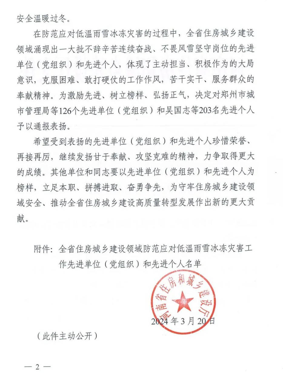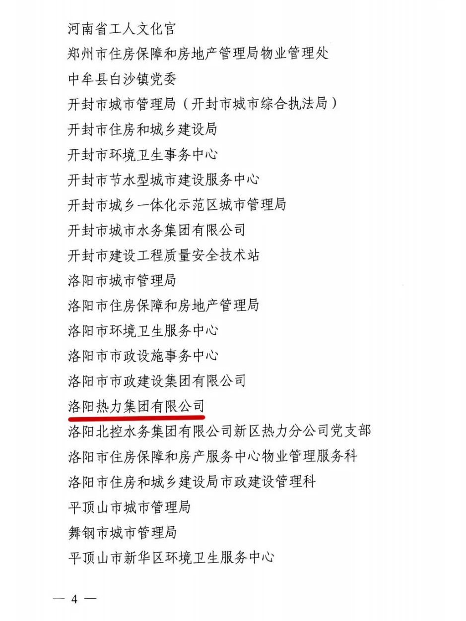 3月20日,河南省住房和城乡建设厅发布了《关于对全省住房城乡建设领域防范应对低温雨雪冰冻灾害工作先进单位(党组织)和个人进行表扬的通报》,表彰全省在低温雨雪冰冻灾害的过程中表现出色的先进单位和个人,洛阳热力集团有限公司受到表彰。