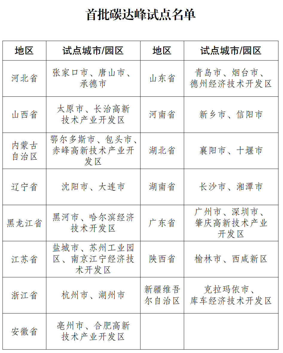 12月6日,国家发展改革委办公厅发布《关于印发首批碳达峰试点名单的通知》,公布了首批25个碳达峰试点城市和10个碳达峰试点园区。