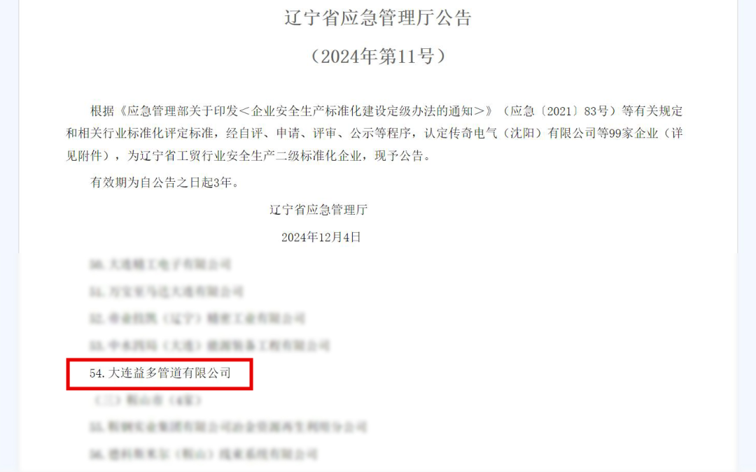 益多一直致力于安全生产标准化建设,持续提升安全生产管理水平,在辽宁省应急管理厅近日公布的安全生产二级标准化企业名单中,大连益多管道有限公司再次上榜。