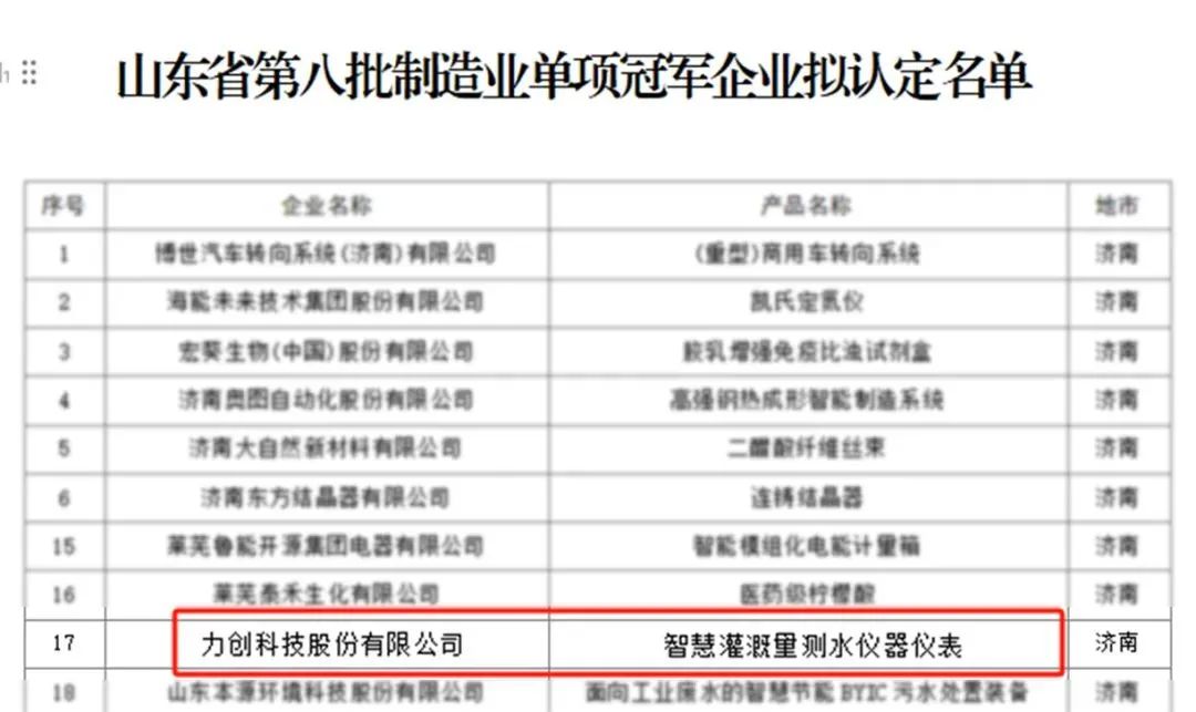 11月19日,山东省工业和信息化厅发布第八批山东省制造业单项冠军企业拟认定名单,经限定性条件论证审核、行业审查、专家论证等环节,力创科技股份有限公司以其卓越的技术实力和创新能力荣获山东省制造业单项冠军企业称号。