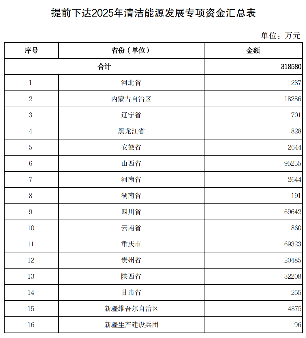 11月13日,财政部官网发布《财政部关于提前下达2025年清洁能源发展专项资金预算的通知》,提前下达2025年清洁能源发展专项资金预算,用于支持非常规天然气开采利用,待2025年预算年度开始后按程序拨付使用,资金总额318580万元。其中,山西95255万元、四川69642万元、重庆69323万元、陕西32208万元、贵州20485万元、内蒙古18286万元,分列第一到第六名。