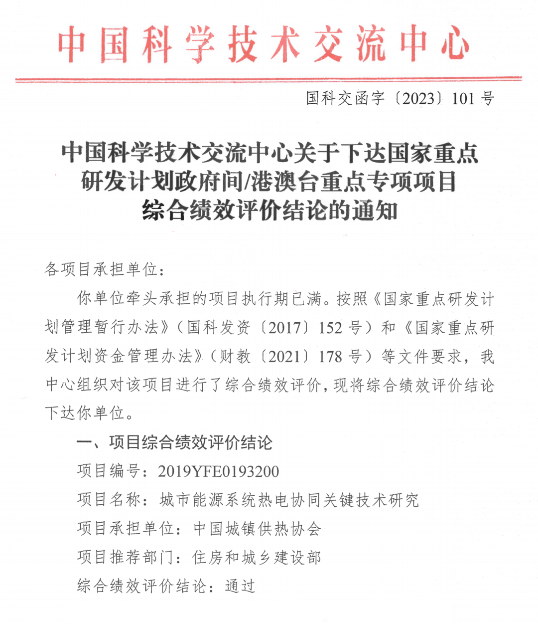 中国科学技术交流中心发布《关于下达国家重点研发计划政府间/港澳台重点专项项目综合绩效评价结论的通知》,中国城镇供热协会(以下简称“协会”)承担的“城市能源系统热电协同关键技术研究”项目经专家组审议通过。该课题隶属于科技部2020国家重点研发计划“政府间国际科技创新合作”专项,由协会申请,经住建部推荐、协会参加答辩评审获得通过后,于2020年1月6日由科技部批准正式立项,是协会与国际能源署(IEA)合作项目,中方由协会牵头,清华大学、北京市热力集团有限责任公司参与,协会副秘书长牛小化为项目负责人,清华大学副教授夏建军为课题技术总负责人。项目组编写了《欧洲主要国家热电协同系统数据分析研究报告》,该报告成为国内外首个定量描述报告,是项目知识层面的核心成果之一;完成了《城市能源系统热电协同关键技术研究文献综述报告》;开展了热电联产相关行业统计工作,编制了《中国城镇供热2021年度发展报告》初稿;立项申请并获得批准编写国家标准《供热运营数据统计方法》;编写了通州新城京津公路以北的区域的热电协同系统设计方案;对辽宁省朝阳市城镇供热情况进行了实地调研,并形成供热专题调研报告;对国家电投东北分公司下属十家三级单位的火电机组进行了调研,形成了专项评价分析报告;成功申请“一种基于相变储热替代市政热水的应急供应系统”“移动式蒸汽储热的生活热水应急系统”两项新型实用专利;并发表了SCI论文等。