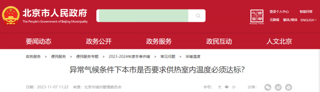 2022年11月10日,北京市城市管理委员会在北京市人民政府网站-政务服务-便民服务-今冬供暖常见问题中对关于“异常气候条件下本市是否要求供热室内温度必须达标?”的问题做出了回复。