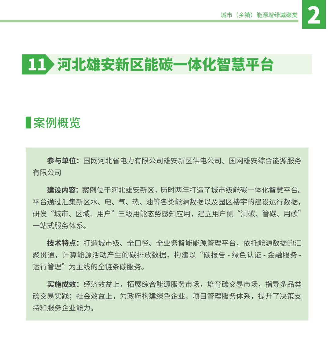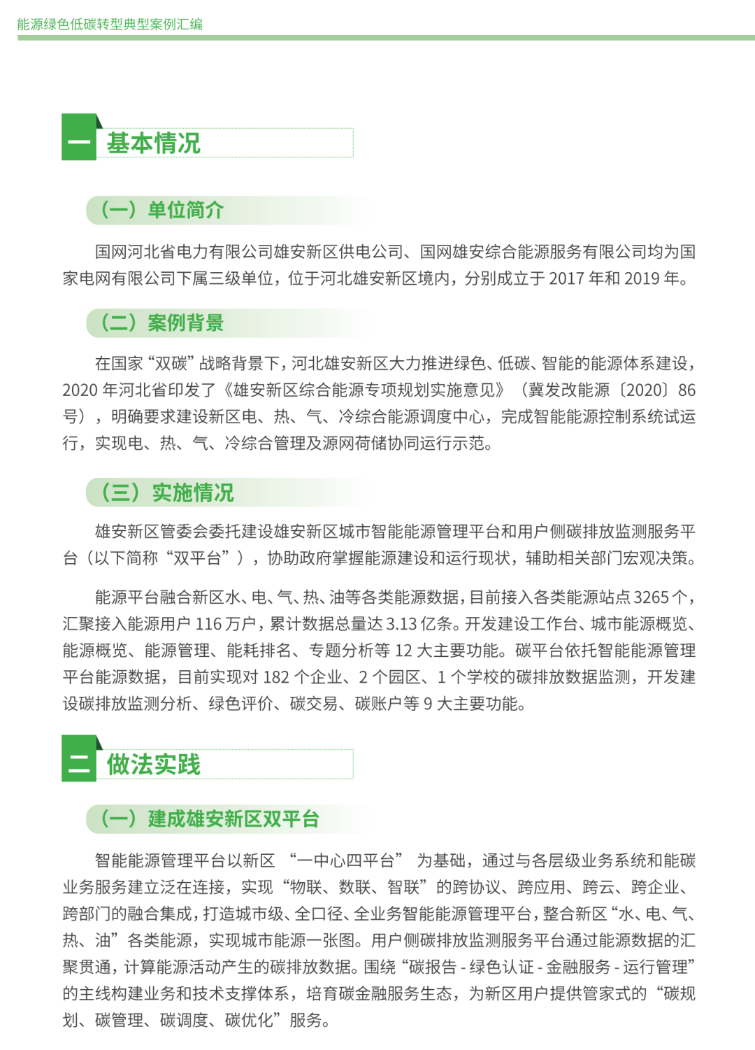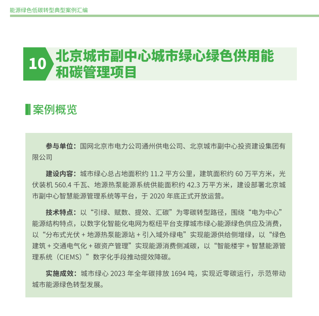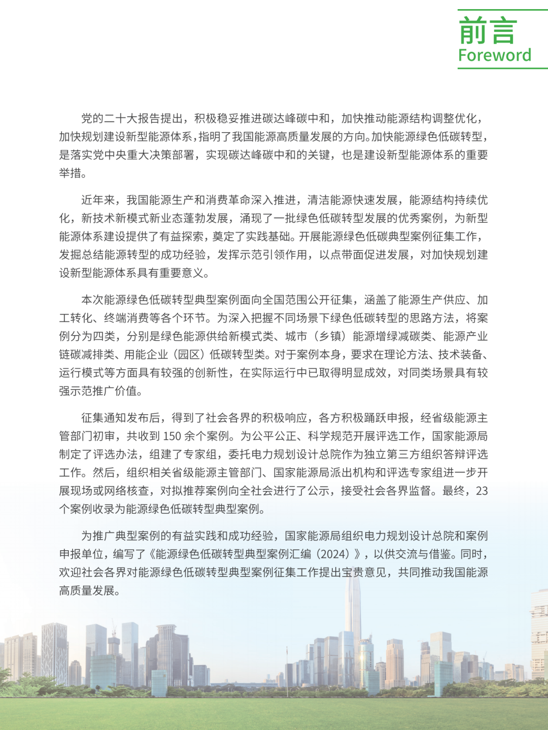 《能源绿色低碳转型典型案例汇编》系统展示了绿色能源供给新模式、城市(乡镇)能源增绿减碳、能源产业链碳减排、用能企业(园区)低碳转型等4类共23个典型案例的基本情况、做法实践、技术特点、实际成效等,旨在为不同领域能源绿色低碳转型提供有益的经验借鉴和实践参考。