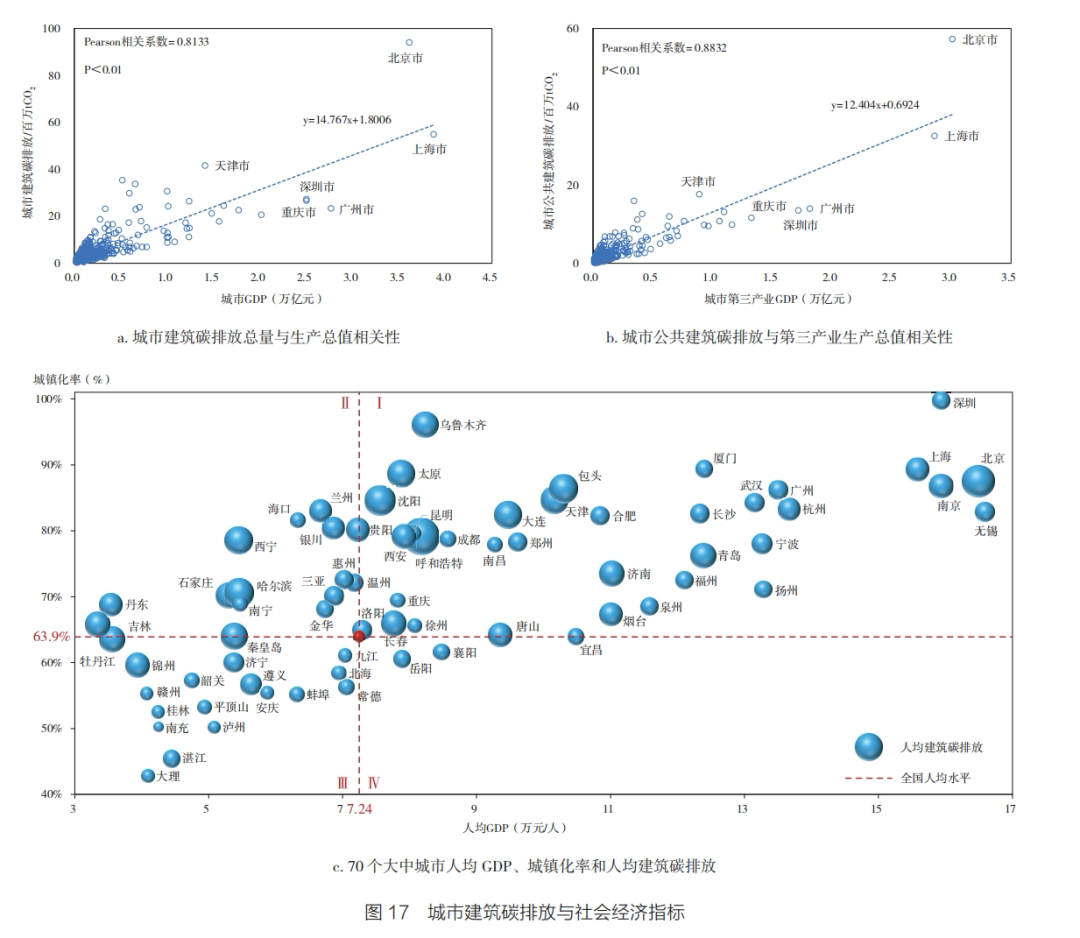 城市建筑碳排放总量与城市GDP的相关系数为0.81,城市公共建筑碳排放与第三产业生产总值的相关性更强,相关系数可达0.88。这说明城市建筑碳排放更多是由消费而并非生产驱动。未来,随着城市经济发展,尤其是第三产业的进一步发展,城市建筑面积、建筑用能需求还将继续增长,城市建筑碳排放还存在较大的增长潜力。