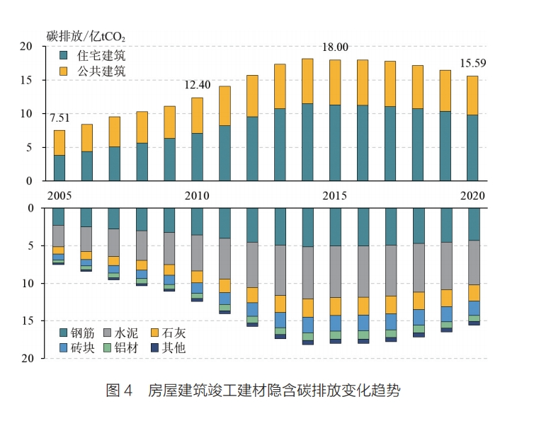 由于建筑业中包括住宅、公共建筑、厂房仓库等房屋建筑和铁路、道桥、隧道、水利水运等基础设施土木工程建筑,建筑建造碳排放也可据此划分为两个口径:一是建筑业建造碳排放,二是房屋建筑建造碳排放。前者涵盖当年所有工程建设项目所消耗建材而产生的的隐含碳排放,可用投入产出法或实物消耗测算法进行核算;后者是当年竣工的房屋建筑所消耗建材而产生的隐含碳排放,不仅包含当年的建材消耗量,还包括往年的建材消费。
