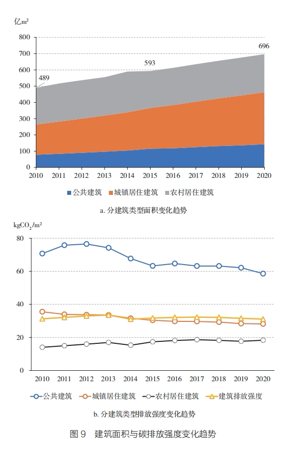 2020年全国建筑碳排放强度为31.1 kgCO2/平方米,城镇居住建筑和农村居住建筑的碳排放强度分别为28.1 kgCO2/平方米和18.3 kgCO2/平方米;公共建筑碳排放强度为58.6 kgCO2/平方米,显著高于另外两类建筑。