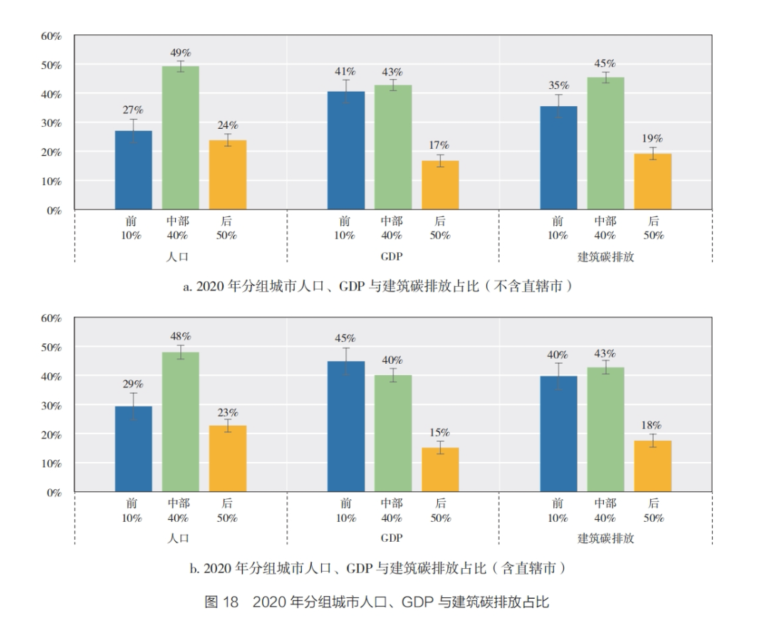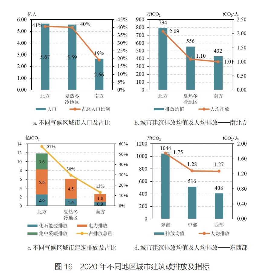 分东西部(东部地区:北京、天津、河北、辽宁、上海、江苏、浙江、福建、山东、广东和海南;中部地区:山西、吉林、黑龙江、安徽、江西、河南、湖北和湖南;西部地区:内蒙古、广西、重庆、四川、贵州、云南、陕西、甘肃、青海、宁夏和新疆)来看,东部地区城市有101个,人口占比43%,建筑碳排放11.8亿tCO2,占比51%;中部地区城市有103个,人口占比30%,建筑碳排放5.3亿tCO2,占比26%;西部地区城市有117个,人口占比27%,建筑碳排放4.8亿tCO2,占比23%。